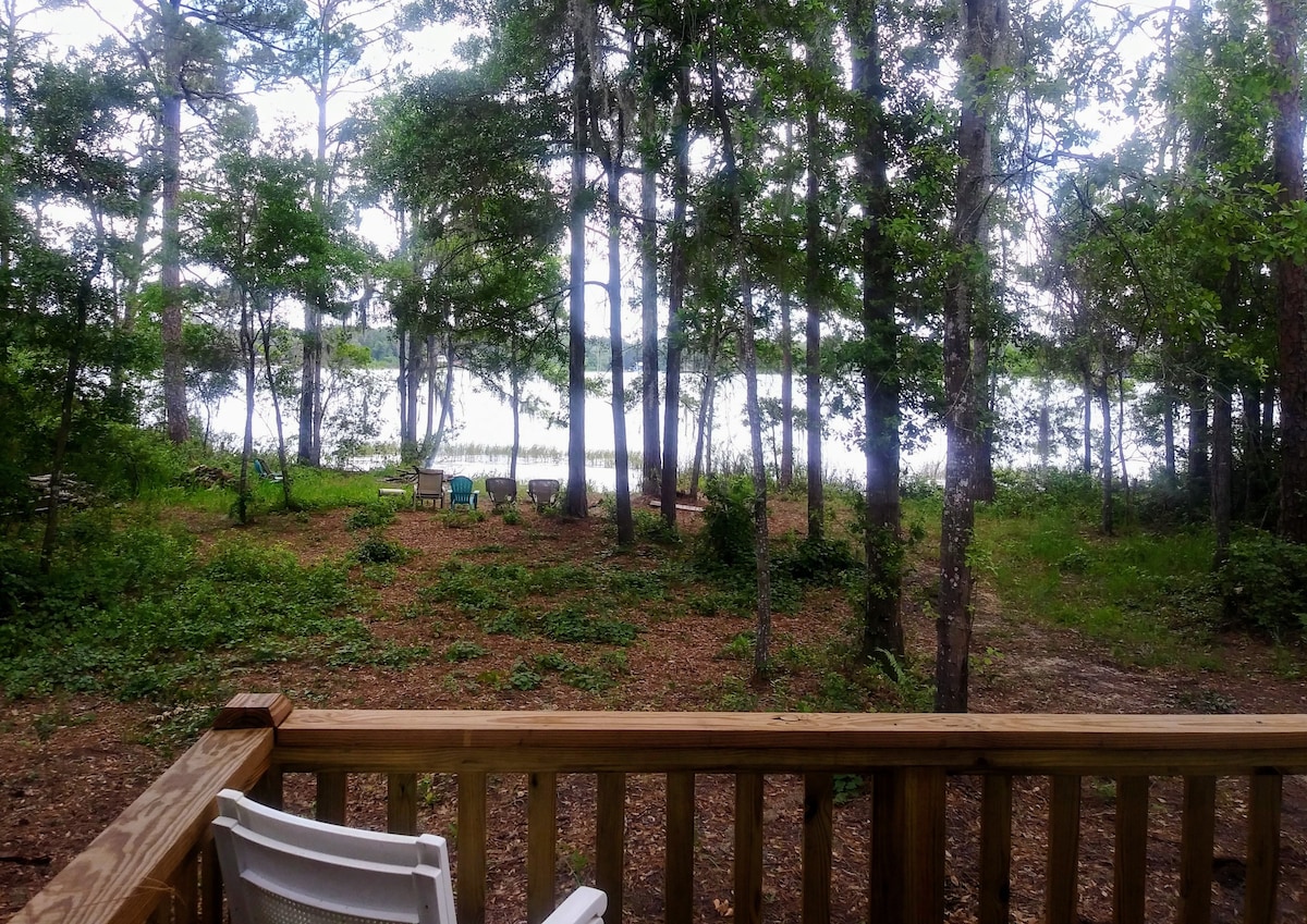 Enjoy stunning lake views while sipping your morning coffee on the back deck. Lots of paddling options exist here on spring-fed Sand Lake. Hosts offer a paddle boat, canoe, and paddle boards for your enjoyment. Practice yoga on your own private deck, fish from the dock, or star gaze around the campfire each night. Discover nearby Florida Springs and beaches all within 30 - 60 minutes. This 800 sq. ft cottage is centrally located between Gainesville & Saint Augustine. Netflix | Hulu | Wifi | BBQ
