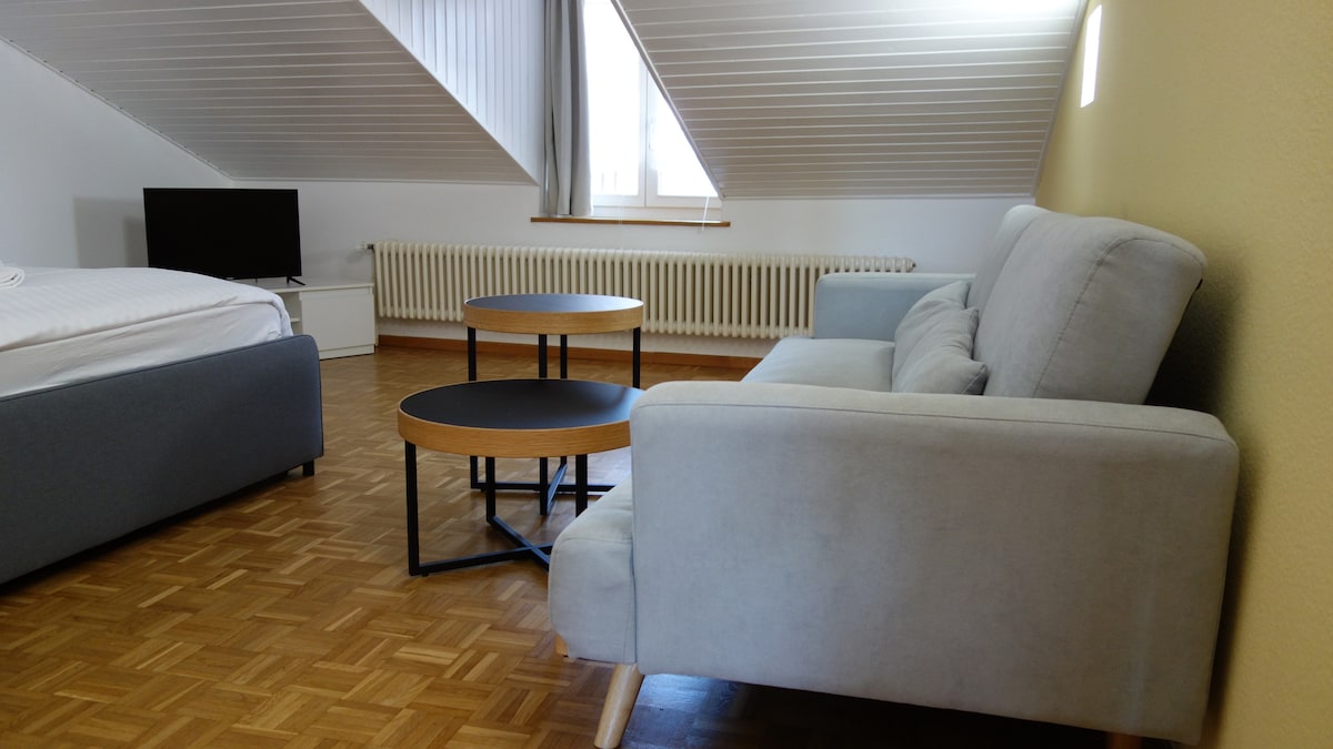 STUDIO, 25 m2 en 10 m2 mezzanine is gelegen aan de voorkant van ons huis. Het bestaat uit een grote kamer met keukenblok, eettafel slaapbank 2 plaatsen. Inloopdouche, toilet. Een mezzanine met een tweepersoonsbed Deze studio is uitgerust met: föhn, strijkijzer, strijkplank, koelkast, magnetron, waterkoker, Nespresso koffiezetapparaat, broodrooster en tv met Swisscom-Box en wifi. Parkeerplaats. Mogelijkheid om fietsen in een gesloten ruimte te verminderen.