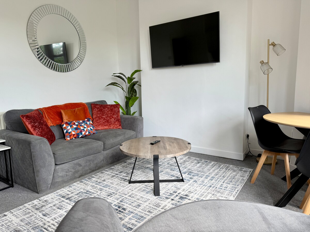 Ruime begane grond appartement met 2 grote tweepersoons slaapkamers. Open keuken en woonkamer met tweepersoons slaapbank, tv en WIFI De keuken is van alle benodigdheden om te koken en te vermaken. De badkamer heeft een dubbele douche en een apart bad, evenals een bijkeuken met wasmachine en strijk- en droogfaciliteiten. De flat ligt op slechts 5-10 minuten lopen van het stadscentrum en het treinstation, en op slechts een paar honderd meter van de Tramshed. Zelf inchecken sleutelkluis