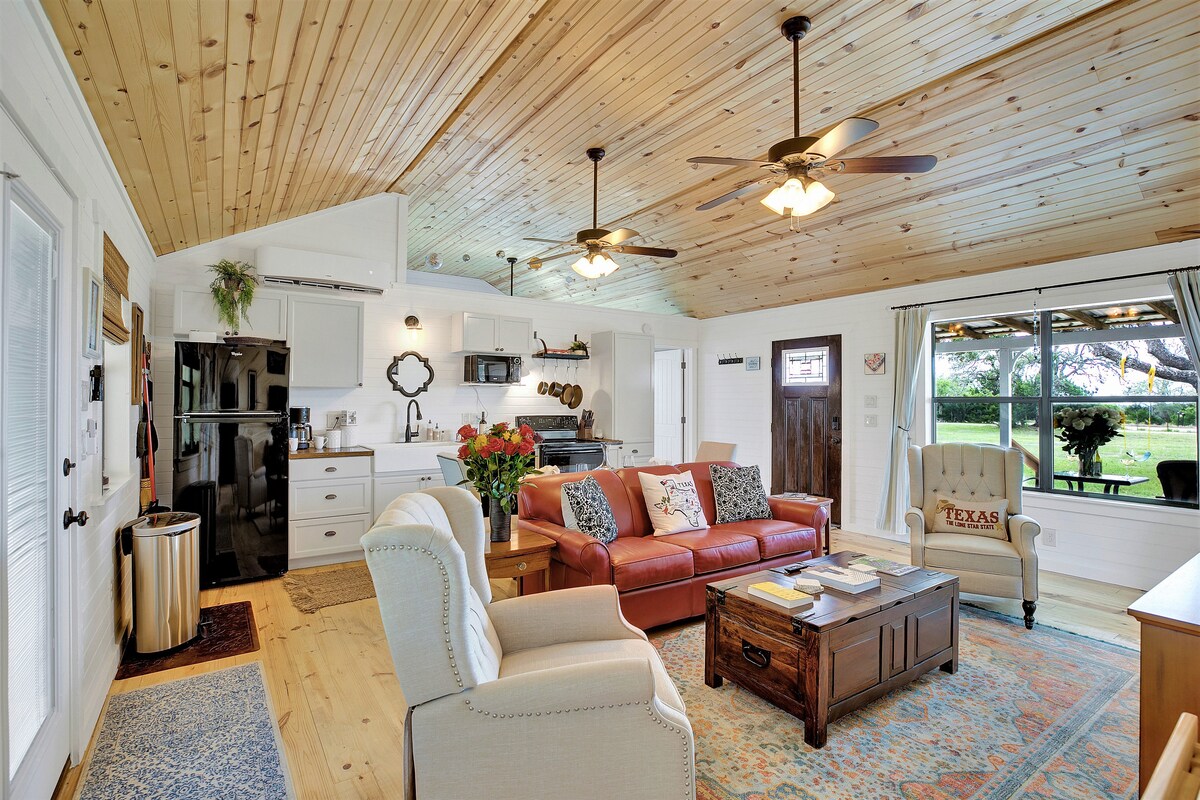 This charming 1940s Sunday house sits on two private acres between downtown Fredericksburg and the 290 Wine Trail. With its own gate and wood-burning fireplace, enjoy sunsets on the front porch, peaceful mornings with coffee, and wildlife viewing. The vintage-inspired living room and kitchen add cozy character. Conveniently located: 5 mi. from Luckenbach, 1 mi. from Bankersmith, 10 min to the Wine Trail, and 10–15 min to downtown Fredericksburg.