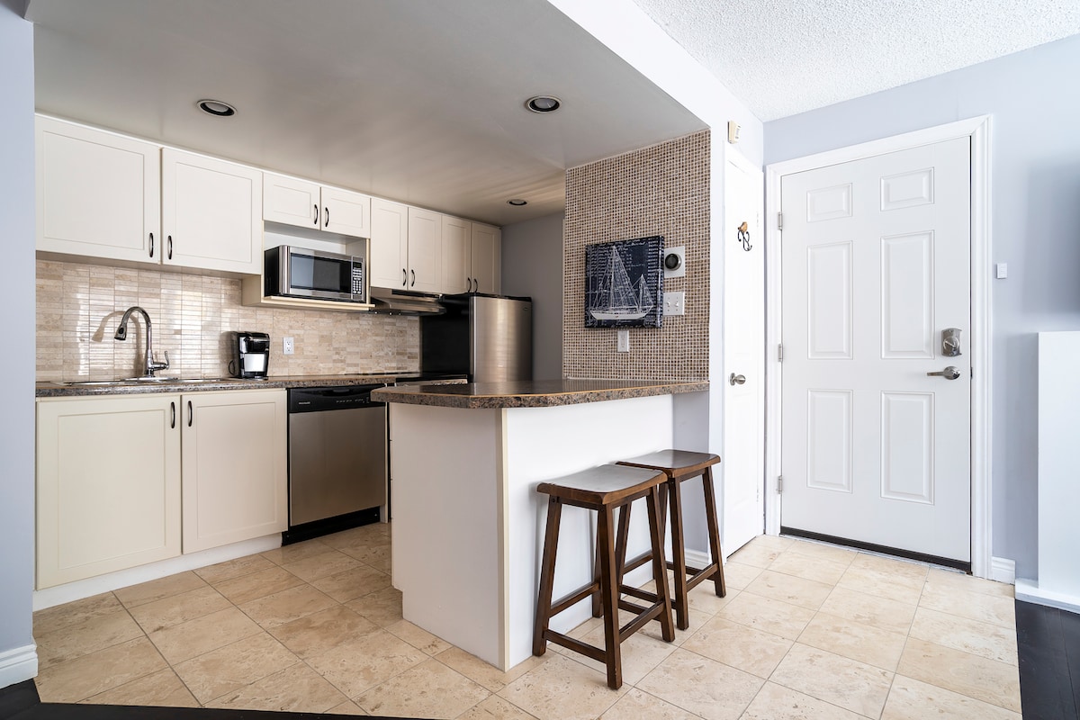Smaakvol gerenoveerd, gemeubileerd en volledig uitgerust appartement met een Europese touch van woonstijl. *Centraal gelegen en naast Living Stone Hotel in Cranberry Village - Perfecte plek om het hele jaar door van attracties te genieten *Korte 10 minuten rijden naar Blue Mountain Village, Ski-Hills, Scandinave Spa, golfbanen, schilderachtige grotten *Dicht bij het meer en de stranden * Café, bakkerij en restaurant aan de zijkant Omgeven door geweldige paden - perfect voor wandelen, fietsen, sneeuwschoenwandelen, langlaufen en nog veel meer.