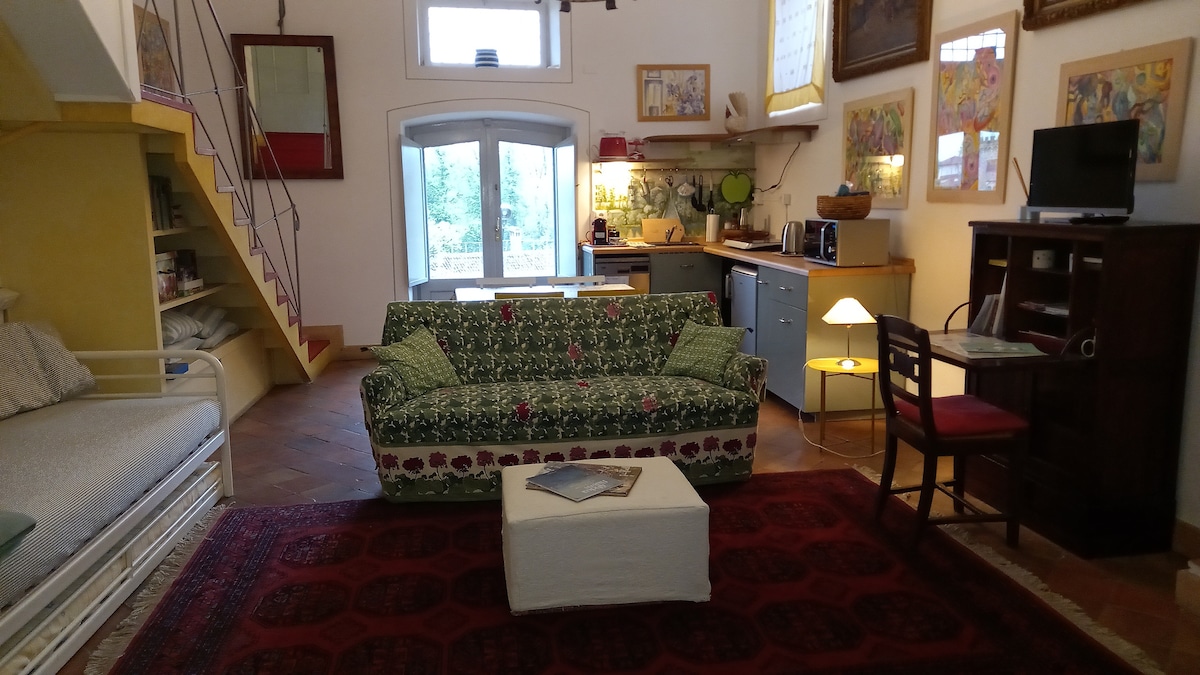 Licht en comfortabel appartement van 45 vierkante meter met een aparte ingang en een groot terras. Het bestaat uit een tweepersoonsslaapkamer en een woonkamer met slaapbank voor twee personen. Het heeft een goed uitgeruste kitchenette en ontbijtbenodigdheden: brood, jam, koffie, thee en brioche, om thuis of op het grote terras van te genieten. Badkamer met douche. Het kijkt uit op een grote privé tuin die wordt gedeeld met gasten van het Groene Huisje. Het heeft airconditioning.