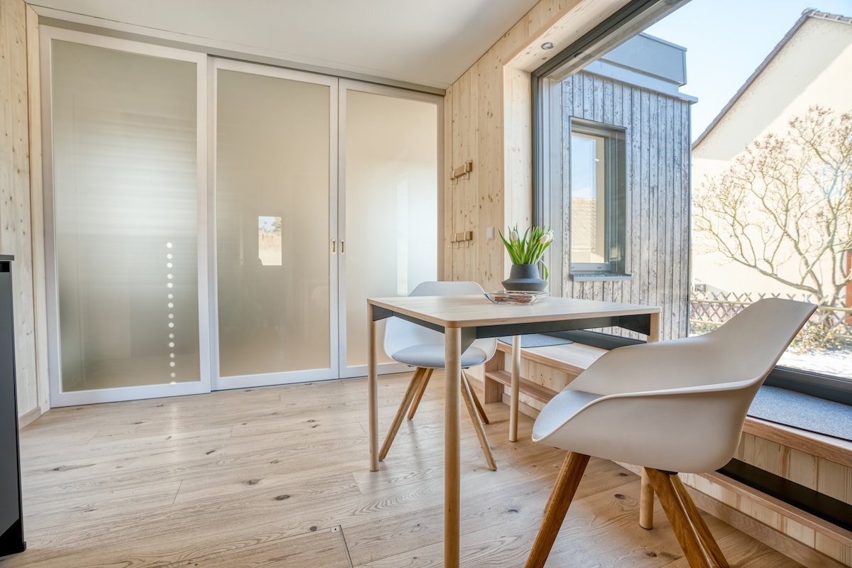 Dieses Modulhaus ist mit nur 33 m² Nutzungsfläche ein echtes Tiny House. Es ist besonders nachhaltig und energieeffizient (KfW40, Qualitätssiegel nachhaltige Gebäude) und kann modular erweitert werden. Es zeichnet sich durch eine besonders hochwertige und ästhetische Ausstattung aus. Es handelt sich um das Musterhaus der Firma Hejmo Homes in Grimma, die Tiny- und Modulhäuser zwischen 25 und 120 m² Nutzungsfläche produziert.