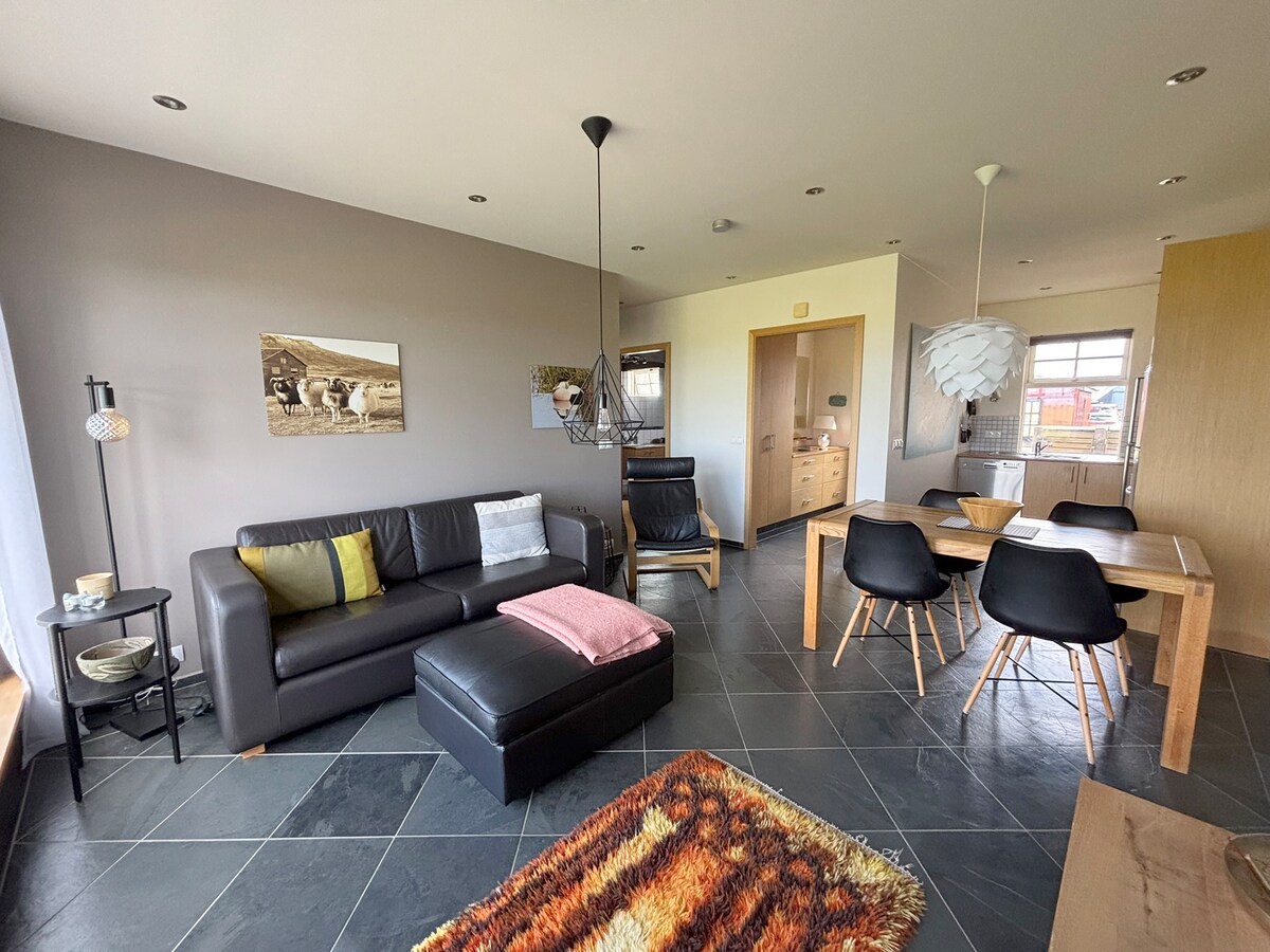 Thuis weg van huis – Met dit appartement met eigen kookgelegenheid vind je alle comfort van je eigen huis, evenals voldoende privacy in een rustige omgeving. Het appartement ligt aan een rustige straat naast de oceaan, het is comfortabel, schoon en gezellig, met alle benodigdheden. Geniet in de zomer van de energieke middernachtzon, kijk hoe paarden grazen in de achtertuin en wilde ganzen en kuikens die rondwandelen. Zie in de winter het majestueuze noorderlicht vanaf het dek en luister naar de kracht van de golven.