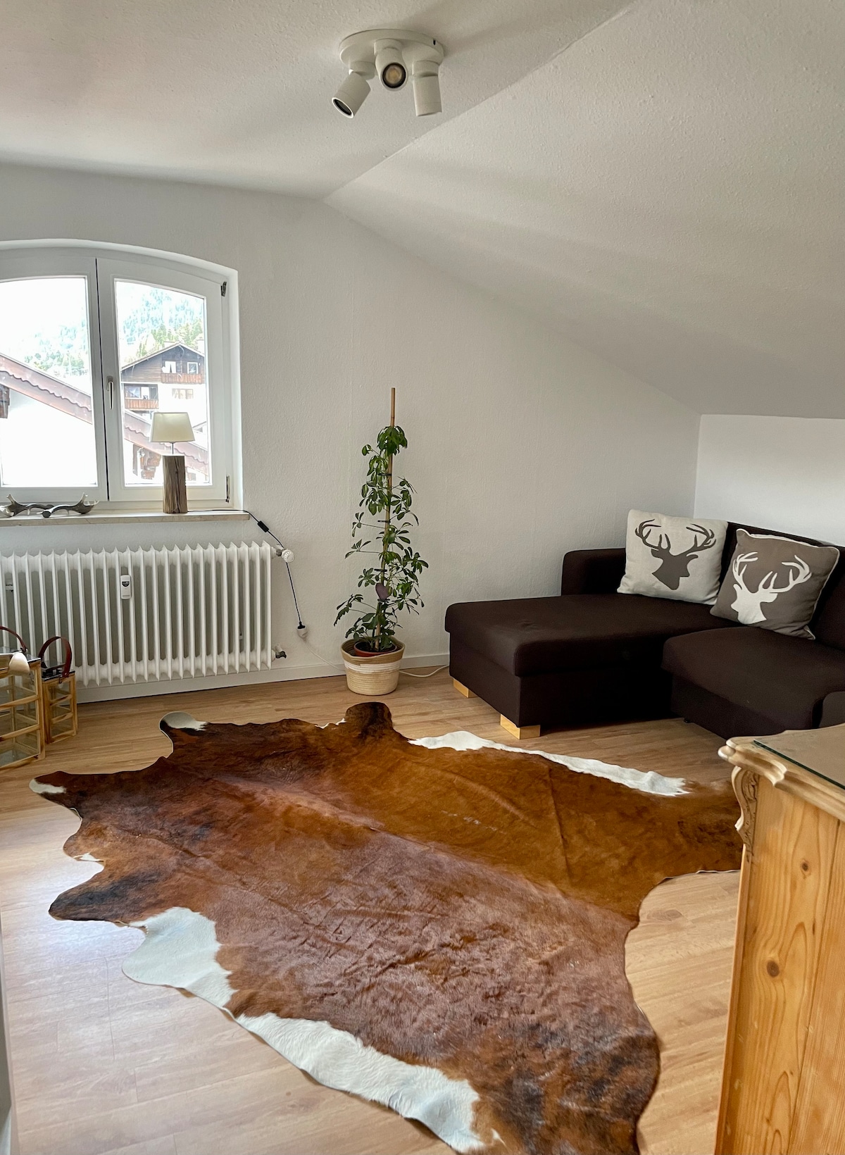 Die Wohnung mit Südausrichtung bietet eine tolle Aussicht auf die Alpenwelt von Karwendel u. Wetterstein. Sie wurde kürzlich neu renoviert und eingerichtet. Es gibt Schlafmöglichkeiten für bis zu vier Personen - sie ist jedoch ideal für zwei-drei Personen. Die Wohnung verfügt über knapp 40 m2 sehr saubere Wohnfläche: Ess-Wohnzimmer (mit grosszügiger, voll ausgestatteterKüchenzeile), Schlafzimmer (mit breitem Doppelbett und neuen Matrazen), eigenes Tageslichtbad, Süd-Balkon, eigener Parkplatz.