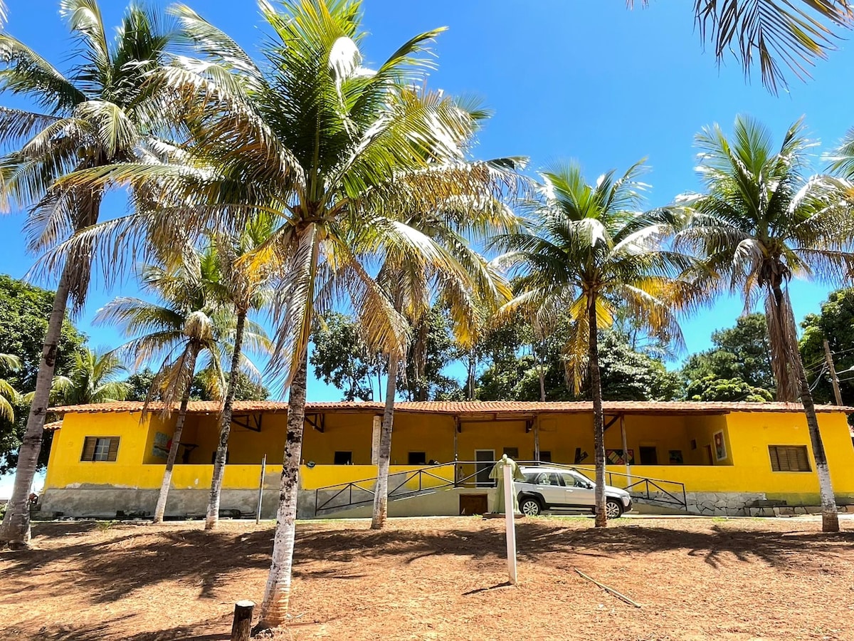 Toevluchtsoord aan de rand van de Emborcação Dam, omgeven door natuur, met twee suites, een grote kamer met twee kamers en een buitenkeuken met houtkachel. Ideaal voor gezinsrust en vissen. De accommodatie ligt op 2 km van de onverharde weg naar de stad. Het ligt op 1 uur van Uberlândia en op 30 minuten van Araguari. We verhuren kano om te vissen. Hier woont ook Torresmo, een volgzame en vriendelijke hond. Hij is vrij om buiten rond te dwalen, accepteert andere huisdieren en woont bij ons in ons huis, ook op het terrein.