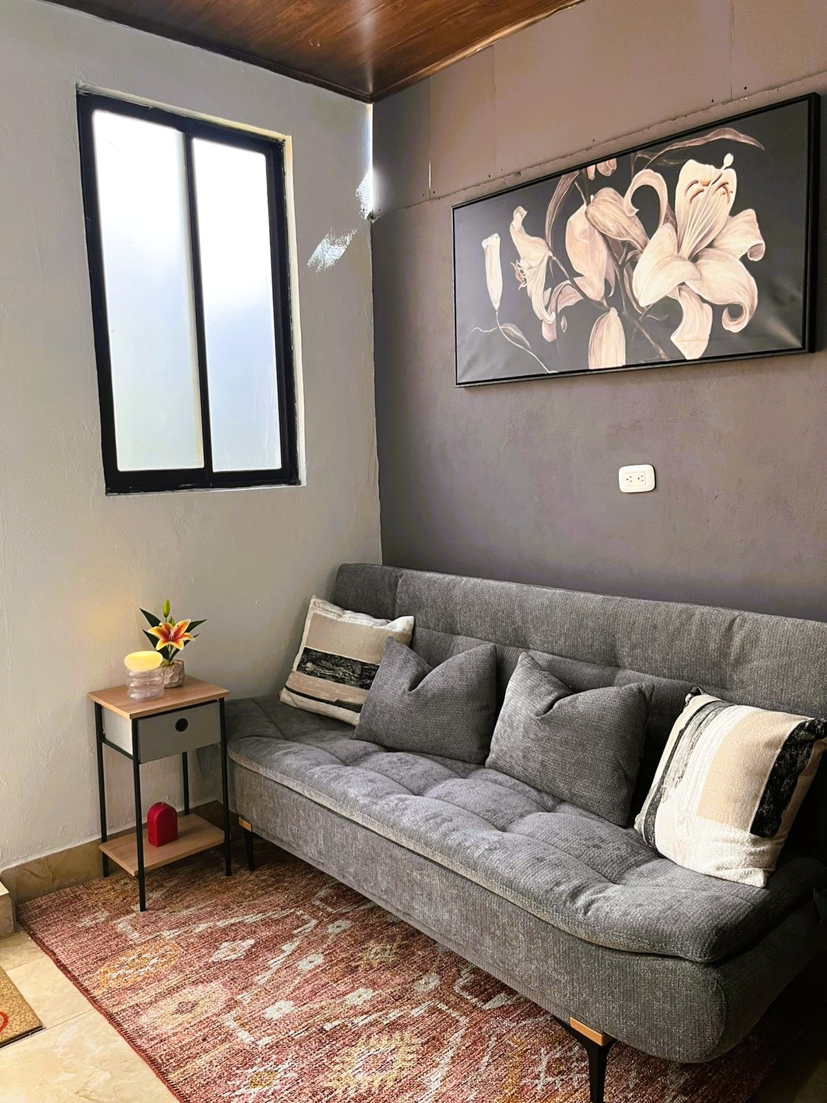 Gezellige loft op slechts 1 km (5 min) van Juan Santamaría International Airport, in een veilig appartement in Alajuela, Costa Rica 🇨🇷✨ Ideaal voor reizigers op doorreis, koppels of digitale nomaden. Het heeft snelle wifi, tv, boeken, bordspellen, gratis parkeren en zelf inchecken. Geniet van het zwembad, de fitnessruimte, de barbecue en de coworking. Dicht bij City Mall, restaurants en met gemakkelijke toegang tot de Poás-vulkaan. Perfect om te ontspannen, te werken of je avontuur in Costa Rica te beginnen 🌿✈️