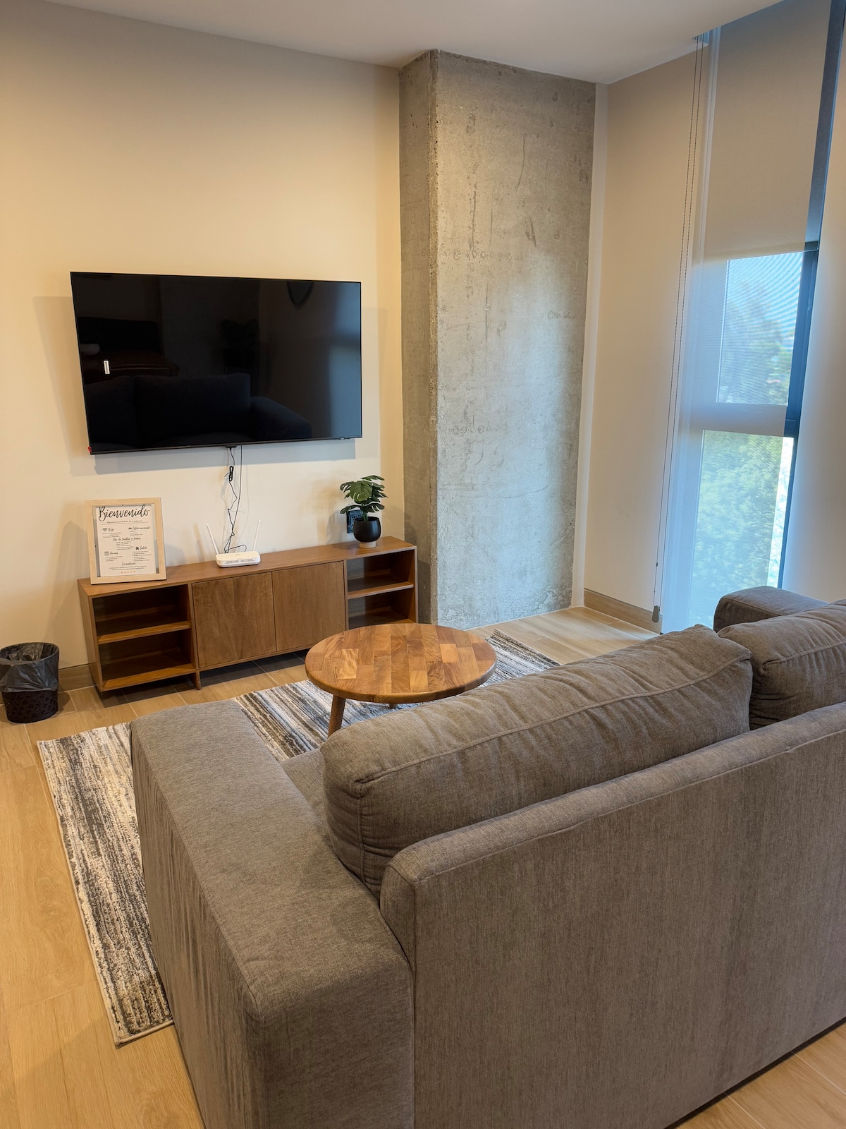 Het appartement heeft airconditioning in de GROTE SLAAPKAMER. De service wordt apart gecontracteerd. Extra kosten van $ 99,00 pesos per dag Kom tot rust in deze rustige en stijlvolle ruimte. Helemaal nieuw met twee slaapkamers. Ruim voor 4 gasten. Met optie voor een 5e [tegen extra kosten]. Met voorzieningen [fitnessruimte, speelkamer, werkruimte, bioscoop]. Uitstekende locatie. In het zuiden van de stad. 5 minuten van de pleinen en supermarkten. We zullen je verblijf aangenaam maken.