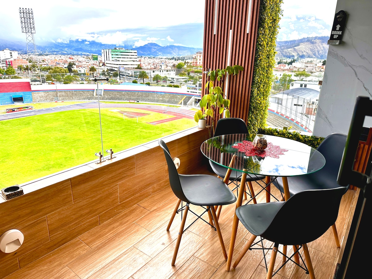 Cuenta con un espacio elegante y renovado, privado y muy cómodo, una suite con una vista privilegiada al Estadio Olímpico de Riobamba, disfruta de eventos, partidos y múltiples actividades desde tu balcón propio, ubicado en pleno centro de la ciudad cerca de todo, cuenta con todos los servicios, un ambiente muy silencioso por las noches y acogedor, dispones de sala, desayunador, cocina, baño privado, balcón, comedor externo, área de trabajo y más.