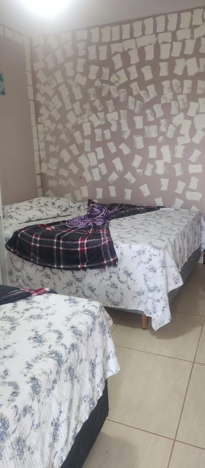 A suíte é ideal para momentos em família, equipada com uma cama de casal e uma cama de solteiro. O quarto é completo, com ventilador, banheiro privativo, roupa de cama, kit de higiene, toalhas de banho, frigobar e guarda-roupa, proporcionando conforto e praticidade para sua estadia.