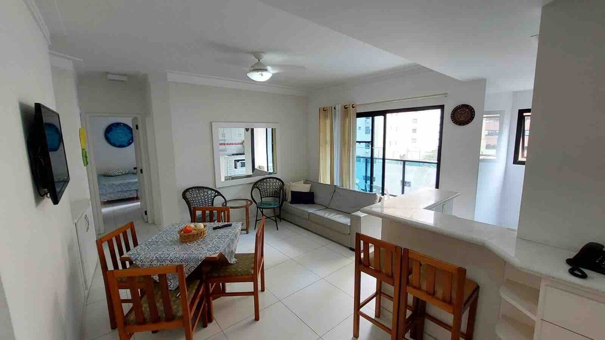 Flat 65 mts2 met uitzicht op zee, 1 slaapkamer met queensize bed en airconditioning, badkamer, grote woonkamer met bank en plafondventilator, tv in de woonkamer, kitchenette, koelkast, kookplaat, oven, compleet keukengerei, wasserette. Het heeft een extra matras Strandservice, binnenzwembad, sauna, speelkamer, gratis wifi, fitnesscentrum, binnengarage, 50 m van het beste deel van het strand van Pitangueiras, naast Morro do Maluf. Dicht bij LaPlage Shopping Mall en restaurants.