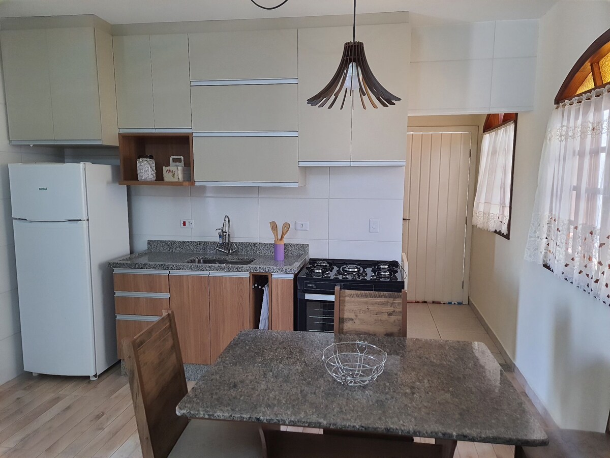 Ontspan met het hele gezin in deze rustige accommodatie. Rua Marisa Rodrigues Tavares 9. Recanto Talisã. Dicht bij het veld São Luis. Gastronomische ruimte buiten en geventileerd met barbecue, houtkachel met oven + pizzaoven. Residentie met drie slaapzalen met 1 suite, woonkamer met keuken +2 badkamers en servicegebied. 600 Mb kabelinternet met wifi. Garageruimte zonder dak en geventileerd.