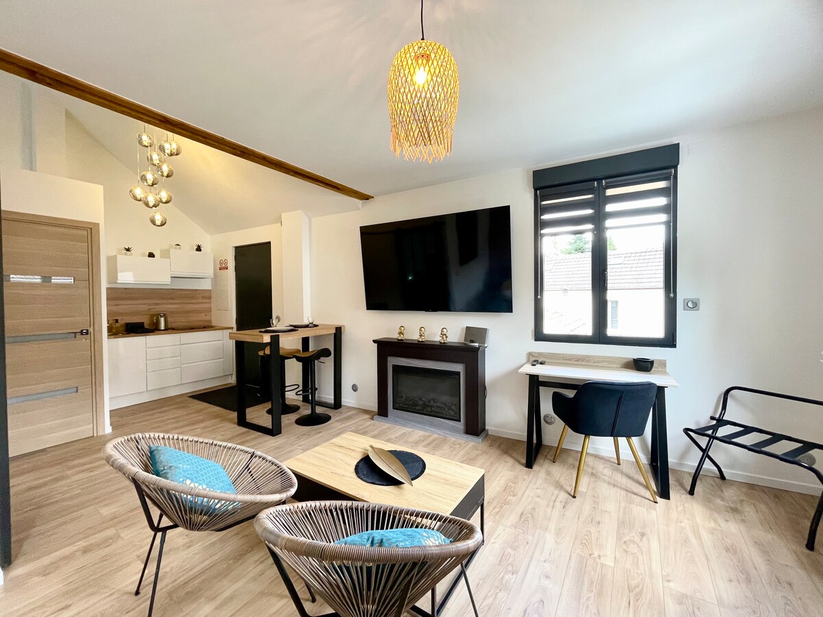 🥇Elegante cocon en privéterras, gecertificeerd '1 ster toeristenmeubilair' in Frankrijk. Welkom in een oase van comfort, ideaal voor een verblijf voor twee. Levendige en rustige buurt in het hart van Bussy-Saint-Georges. Uitzonderlijke locatie: 50 m van de RER A, Bussy-Saint-Georges - Val d'Europe: 1 halte, - Disneyland: 2 haltes - Parijs in 30 minuten Alle winkels, restaurants en diensten liggen op loopafstand. Gezellig interieur, hotelsuite sfeer om te ontspannen na een dag.