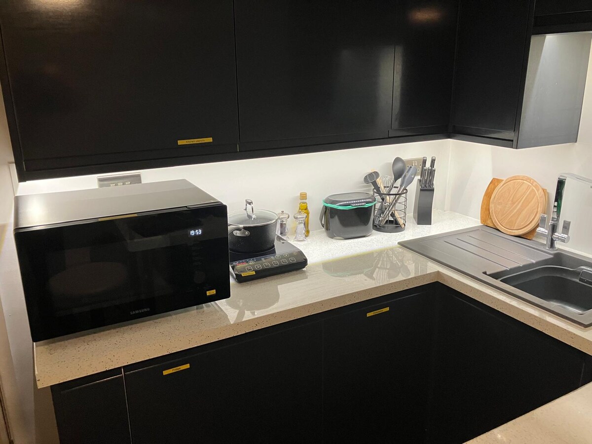 Neem even pauze in ons luxe penthouse. Het enorme balkon op het zuidwesten biedt elke avond een panoramisch uitzicht op de zonsondergang, waardoor het de perfecte plek is om na een dag te ontspannen. Het interieur is helder en modern, met kamerhoge ramen en schuifdeuren die de ruimte vullen met natuurlijk licht. De volledig uitgeruste keuken heeft alles wat je nodig hebt om maaltijden te bereiden en de woonkamer is uitgerust met premium audio (Sonos) en tv voor je entertainment.