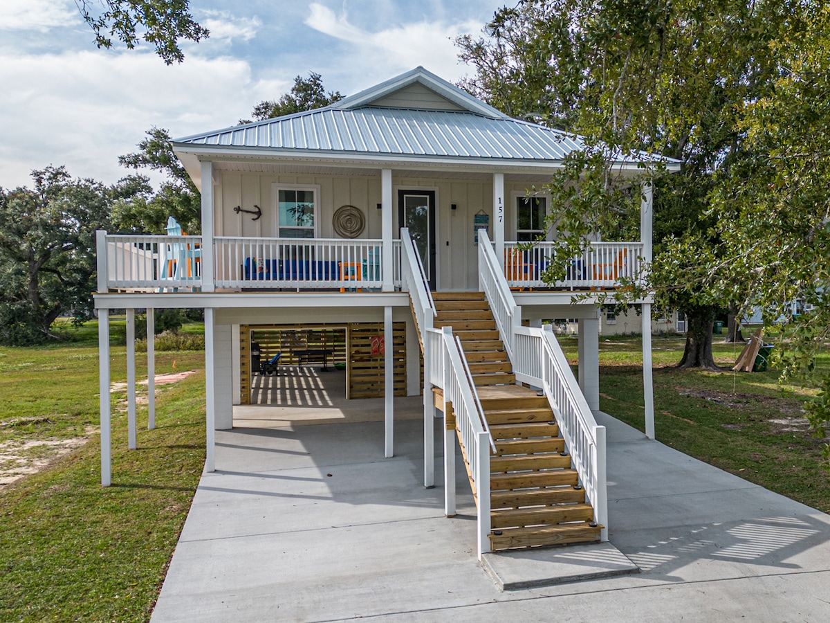 Nieuw gebouwd vakantiehuisje op steenworp afstand van het strand van Waveland. Kustmeubilair, grote veranda 's, overdekte entertainmentruimte, aangepaste vuurplaats. Een korte wandeling naar de vuurtoren, Veterans Park, Dining en het strand (0,3 mijl)! Volledige keuken, glasvezelinternet, veranda, overvloedige zitplaatsen buiten, grill, strandspullen, maïsgat en meer. Pak je koffers en laat je zorgen achter je; omarm rust en vreugde. We hebben een omheind gebied voor je huisdier om mee te gaan en we doneren een donatie aan de lokale schuilplaats. EV-oplader!