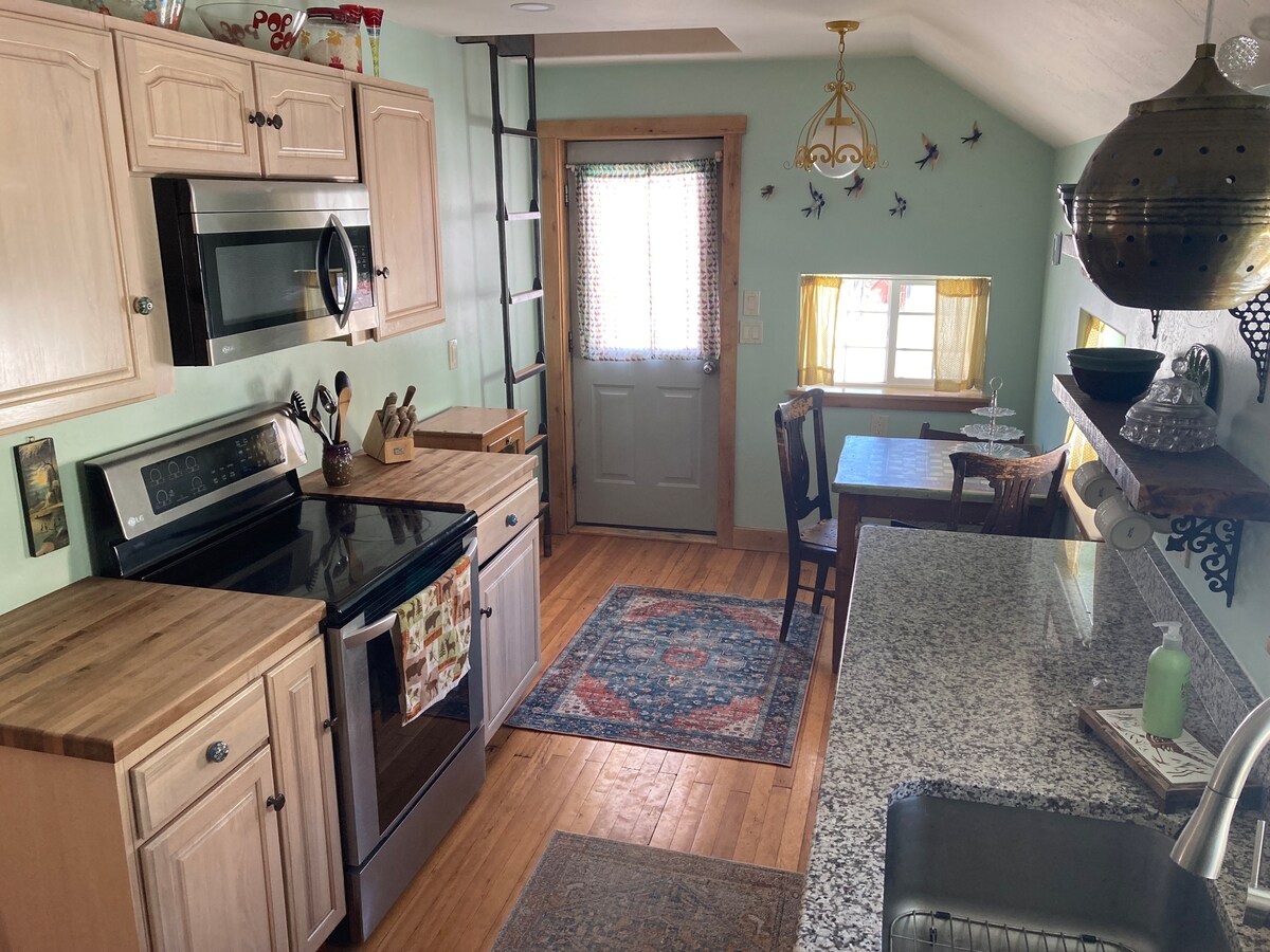 Stylish charm with lofted sleeping space up a ships ladder, boasts a new Queen Nectar Mattress. Up the ladder sleeping loft is only for the fit and adventurous. Must be comfortable on your knees because it’s a low headroom situation. There is a main level futon sofa sleeper too if need be. Lovely park like setting with outside firepit and charcoal Weber mini grill. Kitchenette is pretty well outfitted. Tiny Cottage has plenty of charm and comforts. Groovy wooden beads across bathroom door.