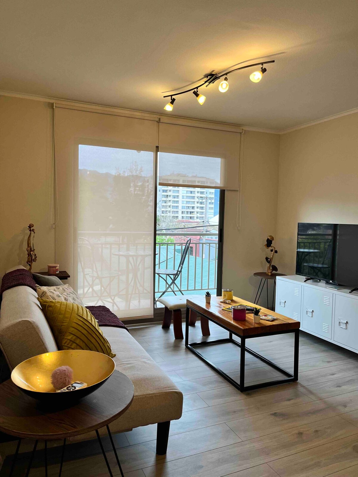 Edificio en pasaje interior a 150 mts. de calle principal, que une Quillota y La Cruz; la unidad es full equipada y cuenta con ventanales termo-panel, Dormitorio con cama 2 plazas, veladores, closets, baño en suite con tina y un SmartTV 32" que incluye Netflix, Disney, Prime Video, app MovistarTV. Ambiente principal cuenta con un Sofá Cama (futón) cocina americana, encimera, 2 pisos, horno eléctrico, hervidor, etc; sector muy tranquilo y céntrico a pasos de un Strip-Center. Disfrute su estadía.