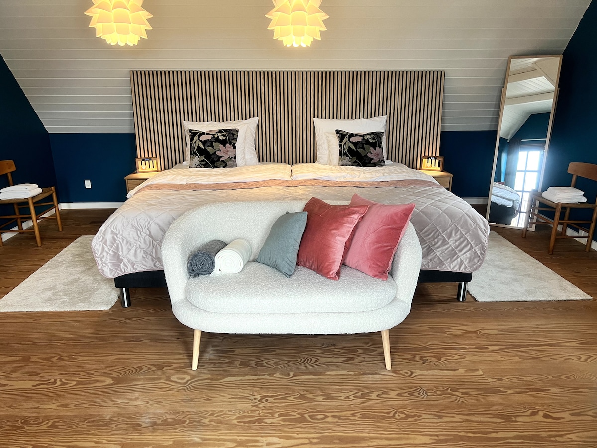 Geniet van gezelligheid en rust in ca. 50 m2 licht en mooi appartement onder het plafond in een verbouwde schuur. 1 van de in totaal 2 appartementen. Gebouwd in 2021. 2 slaapkamers, woonkamer met slaapbank, volledige keuken en eigen badkamer. Toegang tot gedeeld zwembad. Pure idylle op het platteland, maar op slechts 2,5 km van goede winkels, evenals ongeveer 10 minuten rijden naar een fantastisch kindvriendelijk zandstrand. Honden, katten en paarden. Eigenaar woont op het terrein, maar voor de tweede lange. Fibernet en tv-pakket. NIEUW 2025: Gameroom met tafelvoetbal, tafeltennis en retro gameconsole.