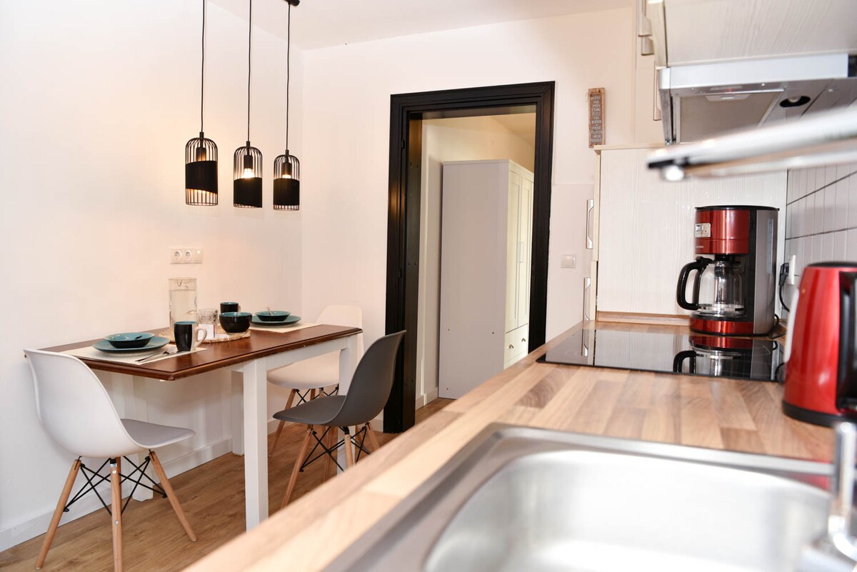 Beautiful 3-room apartment with garden, approx. 70 sqm in Morsum, completely renovated with south-facing terrace and garden, open kitchen-living room, fully equipped. Living room, hallway, bathroom, 2 bedrooms with windows, terrace and garden. High-quality equipment, including baby bed, children's high chair, bathtub, washing machine and dishwasher, Nespresso machine, oven, 4-burner stove, cable TV, WiFi, gas grill and piano. 5 minutes walk from the train station and the sea, max. 1 dog welcome!