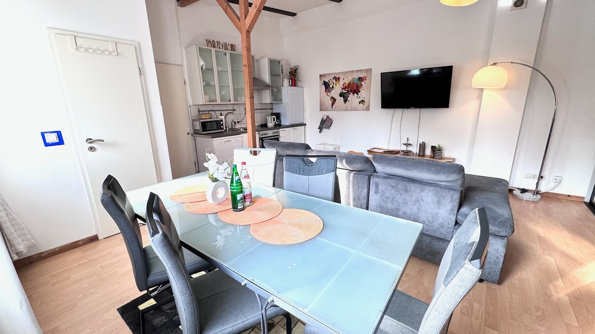 Industriële charme in hartje Eimsbüttel. Onze liefdevol ingerichte loft kan maximaal 7 gasten ontvangen met slaapruimtes in de grote kamer en twee aparte slaapkamers. De ruime loft biedt voldoende ruimte voor een onvergetelijke en samen tijd in Hamburg. Snelle wifi, een grote design-tv, een Acarde Pac Man en een videorecorder met veel oude geliefde videocassettes laten zeker niet alleen de harten van bioscoopfans sneller kloppen.