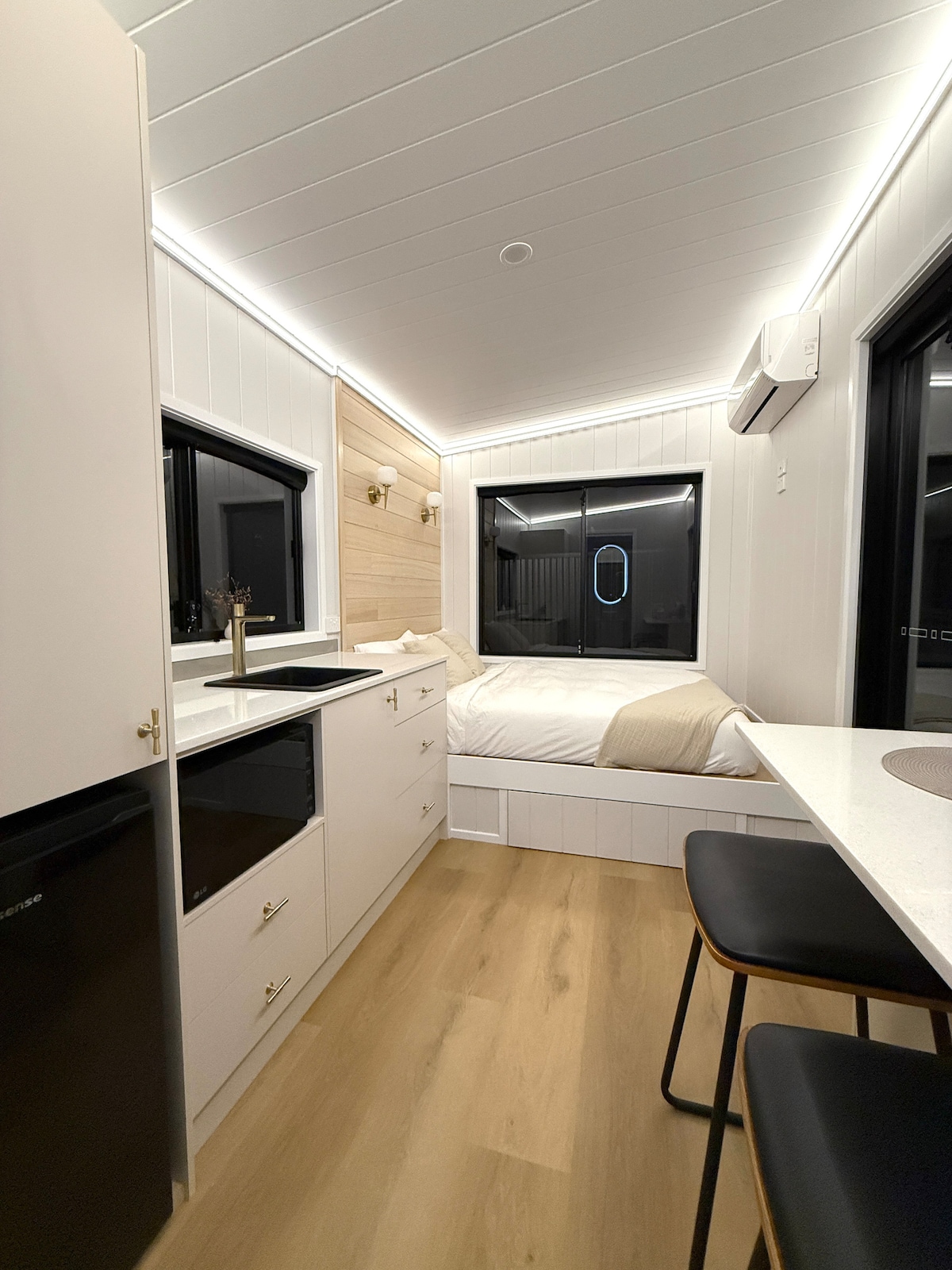 Welkom bij Brand New Tiny Harmony. Elk detail fluistert comfort en luxe. Laat je zakken in zachte Canadese ganzenveren en drijf weg op zachte, hoogwaardige lakens. Maak eenvoudige maaltijden in de kleine kitchenette en geniet vervolgens van ze bij het raam terwijl het zonlicht naar binnen dansen. Wikkel jezelf in een Sheridan-jas en voel je toegeeflijk en toch vredig. Sluit je dag af met een film in bed via Netflix of Disney+ of door te genieten van de zonsondergang. Tiny Harmony is niet zomaar een verblijf, het is een herinnering die wacht om gemaakt te worden.