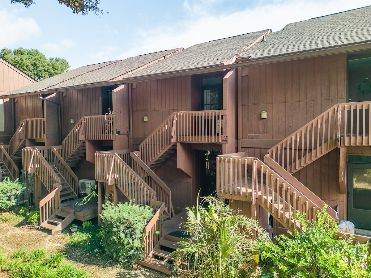 Steps away from the Country Club and 36 holes of golf! Remodeled & updated 2nd floor condo overlooking the lake at Lakeside Villas. Our studio condo offers sleeping for 4 with a full kitchen, fireplace, & smart TV in a cozy, bright environment. The covered back porch is the perfect place to unwind after a day of golf or relax at the pool by the lake. Mature oaks, park like setting. The complex is next door to the Clubhouse & Grill+Bar. Fan favorite property!