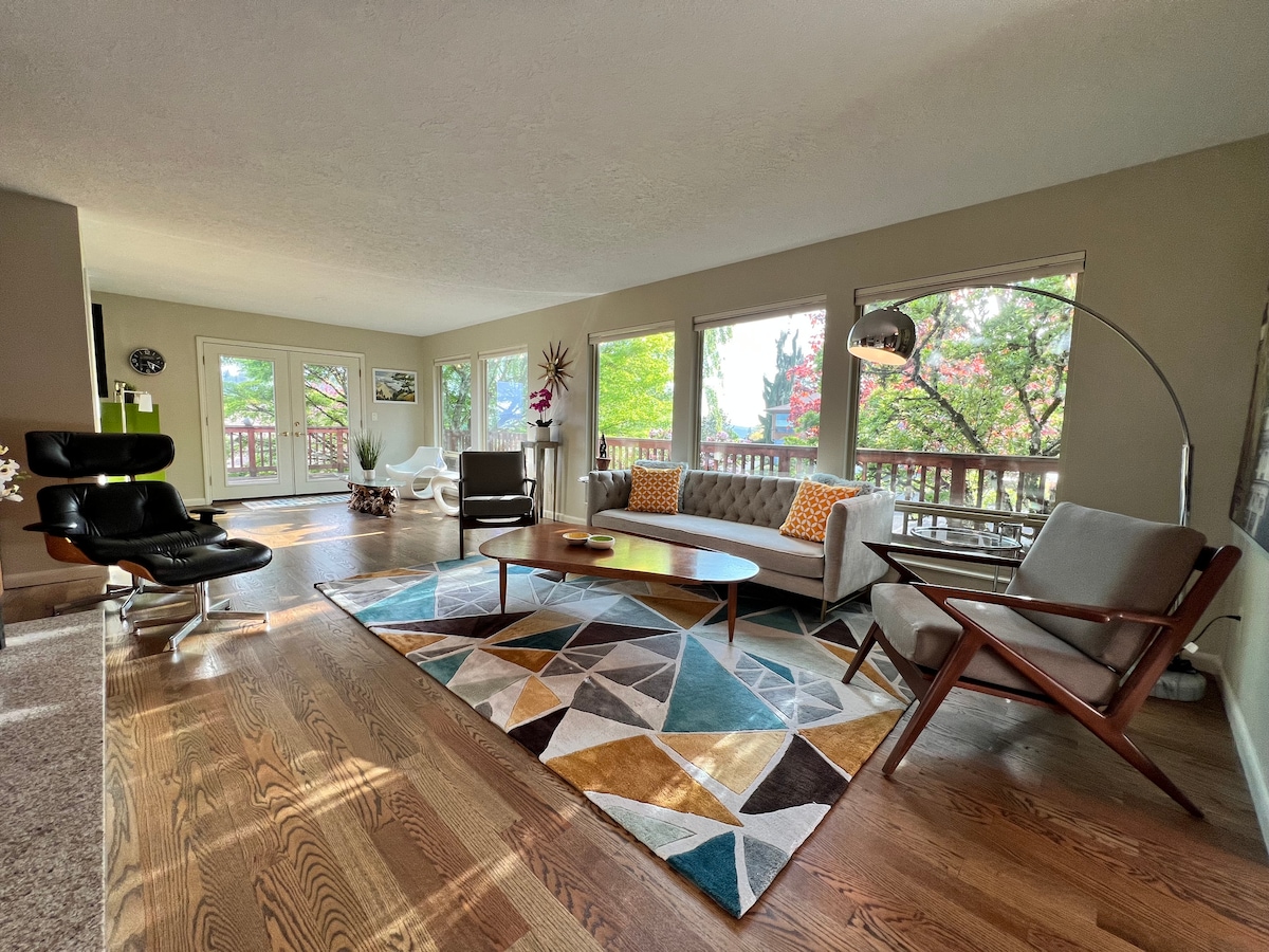 Net opnieuw geadverteerd omdat we langetermijnhuurders hadden vanwege totaal verlies door brand. 3400 vierkante voet heuvelachtige retraite ingericht met zeldzaam meubilair. Geniet van het Cascade-gebergte vanaf het terras en de lounge onder gigantische esdoornbomen. Je zult genieten van de 125 inch Hi-Def filmtheater (met meer dan 200 films)! Twee grote primaire suites met kingsize bed en grote douches. Een extra slaapkamer met queensize bed en een groot kantoor. Dicht bij de stad en de natuur, 20 minuten van de luchthaven, met dagtochten naar alle must-see plekken in PNW.