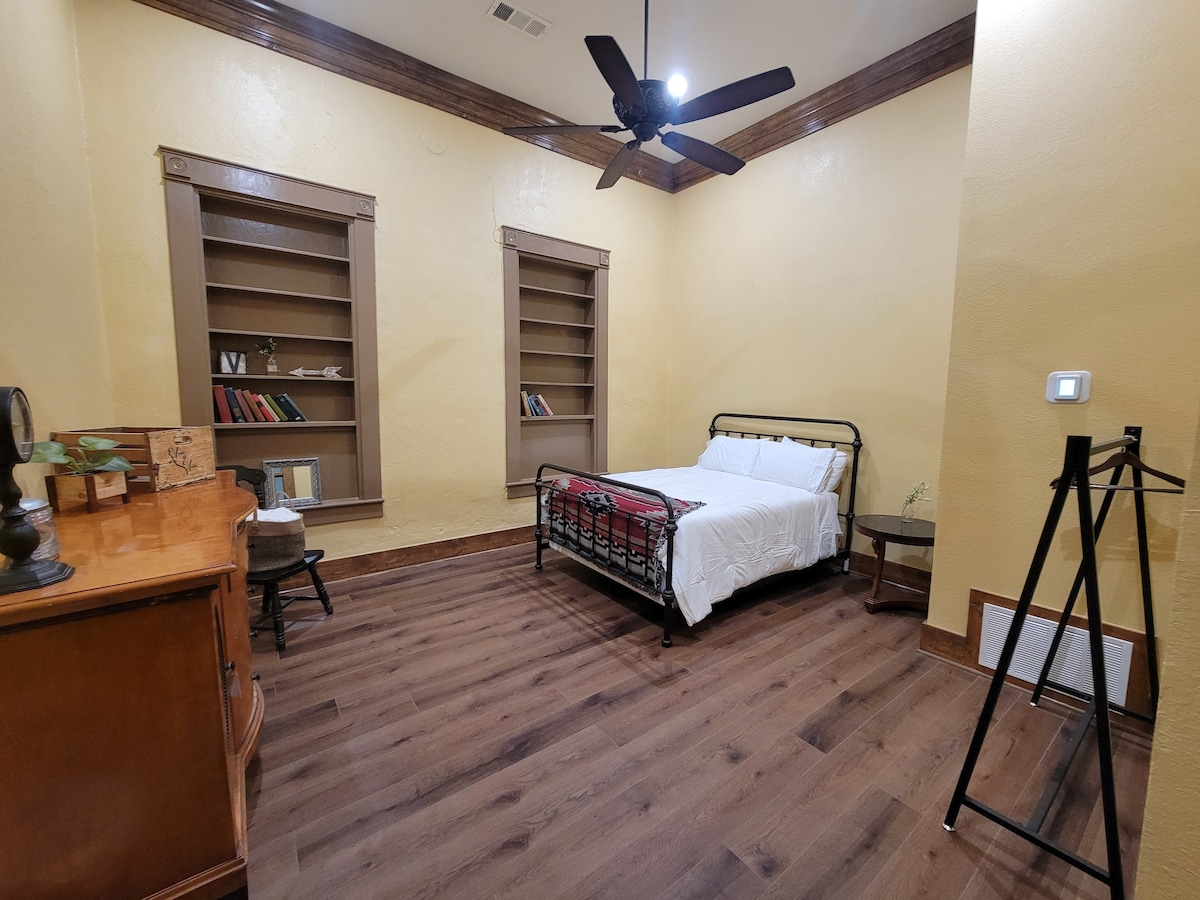 Kom tot rust in onze charmante hotelsuite. Met een koffiebar en een kingsize bed dat aanvoelt als wolken, zul je zeker ontspannen in deze perfect pittoreske boetiekhotelsuite aan de historische Main Street in het centrum van Quanah, Texas. Ervaar de geschiedenis in dit prachtig gerestaureerde gebouw vol architectonische details. Perfect voor koppels of een klein gezin (bank voor 2 personen). Wandel door de bakstenen straten om te winkelen of te dineren in de buurt. Boek vandaag nog je verblijf bij ons! (Bovenunit - Niet rolstoeltoegankelijk.)
