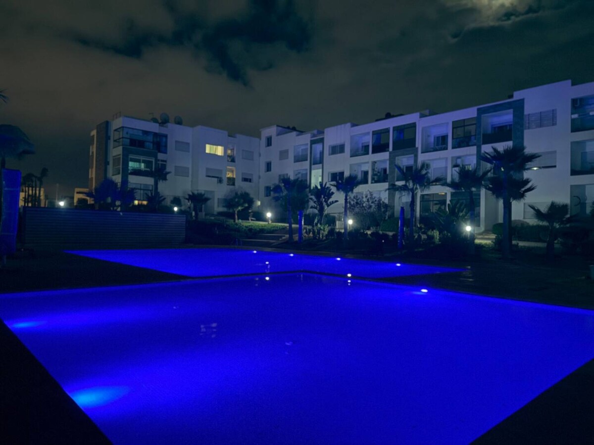 Dit comfortabele appartement ligt op slechts enkele minuten van de luchthaven Rabat-Salé en is ideaal voor reizigers die op zoek zijn naar functionele accommodatie. Makkelijk bereikbaar met auto of openbaar vervoer. De appartementen hebben alle voorzieningen om je verblijf comfortabel en plezierig te maken, waaronder volledig uitgeruste keukens, ruime woonkamers en eigen balkons. Wifi en tv. Met zijn gunstige locatie en moderne faciliteiten is dit appartement een ideale uitvalsbasis voor je reizen.