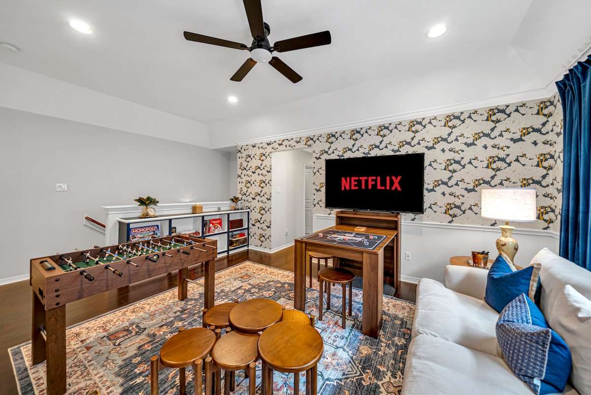 Welkom bij de Boutique Bunkhouse - je ruime Cypress-vakantiehuis op slechts vijf minuten van Houston Premium Outlets. Deze woning van 334 m² beschikt over 4 slaapkamers, 3,5 badkamers, een privézwembad, een vrijstaand bubbelbad, een biljartkamer, een theater met Xbox en een volledige keuken. Geschikt voor maximaal 20 personen met 2 kingsize bedden, 1 queen-over-queen stapelbed en 3 full-over-full stapelbedden. Perfect voor professionals, gezinnen en groepsreizen. Oplaadpunt elektrische auto, smart-tv's en huisdiervriendelijk. Stilte-uren 20.00-8.00 uur. Evenementen of feesten zijn niet toegestaan.