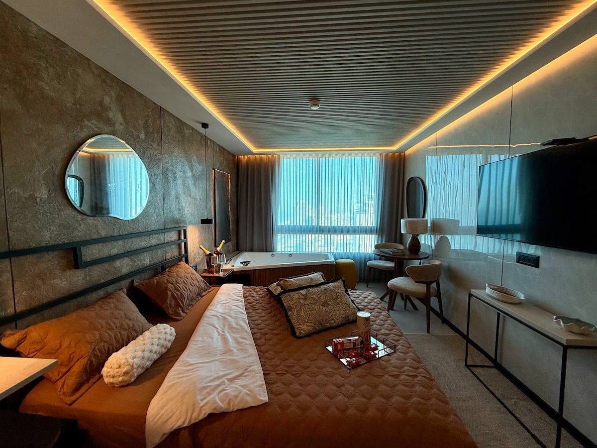 Welkom bij C Tower Sea of Love Suite 💙 Een romantische designstudio gelegen op de 18e verdieping met een adembenemend panoramisch uitzicht op zee. Geniet van de eigen jacuzzi, het moderne interieur en de gezellige sfeer — de perfecte ontsnapping voor stellen. De studio is voorzien van een volledig uitgeruste kitchenette, airconditioning, wifi en een smart-tv. Op slechts een paar stappen van het strand, restaurants en de promenade. 🌊 Ontspan en word verliefd op het uitzicht op zee — je romantische uitje in Netanya wacht op je.