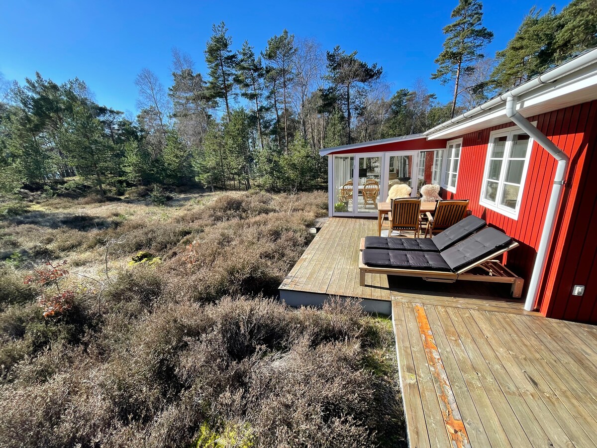 Nieuwe vloeren, keuken en meubels gedaan in 2024. Zie nieuwste foto 's. Ons gezellige huis is gelegen in een beschermd bos op Bornholm in de buurt van Due Odde. Het huis ligt op 1 minuut lopen van een van de beste zandstranden van Denemarken, die je meestal helemaal voor jezelf hebt. Boodschappen doen op zes minuten afstand. Het gebied heeft prachtige natuurpaden, waar je niet veel mensen zult ontmoeten. Het huis heeft 3 slaapkamers, een serre, een badkamer en een grote keuken. Daarnaast is er ook een groot terras.