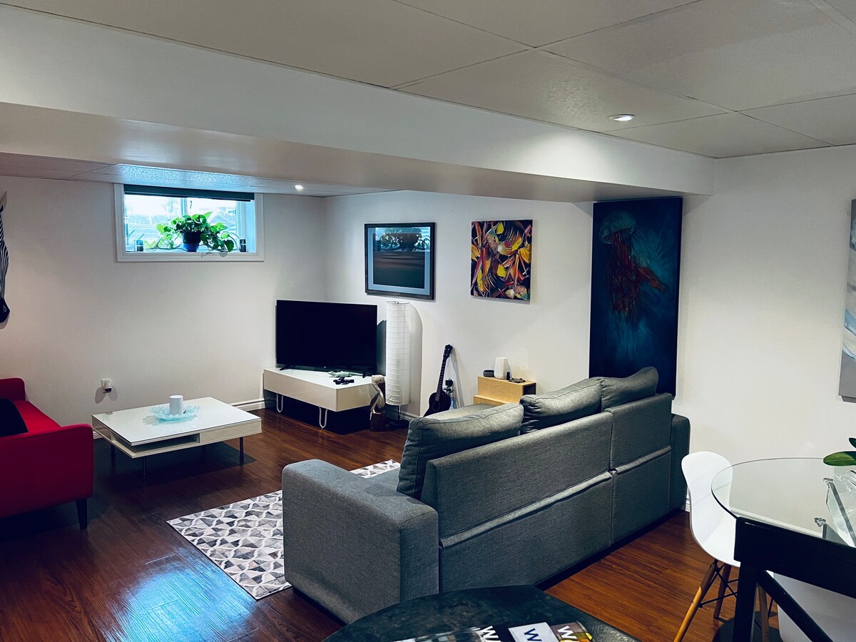 Een mooi helder ingericht kelderappartement op slechts 2 minuten van de 401. Prachtige achtertuin aan de rivier de Moira. Minuten van de Quinte Mall, slijterij, Walmart en restaurants. 5 min. naar het centrum De suite heeft een queensize bed, een 3-delige badkamer, een koelkast/vriezer, een magnetron, een keurig koffiezetapparaat, koffie, een waterkoker, een convectieoven en een broodrooster. Strijkijzer 5G-snelheids Handgeschilderde houten vloeren en open haard. Originele kunstwerken en handgeschilderde schilderijen van mijn dochter.