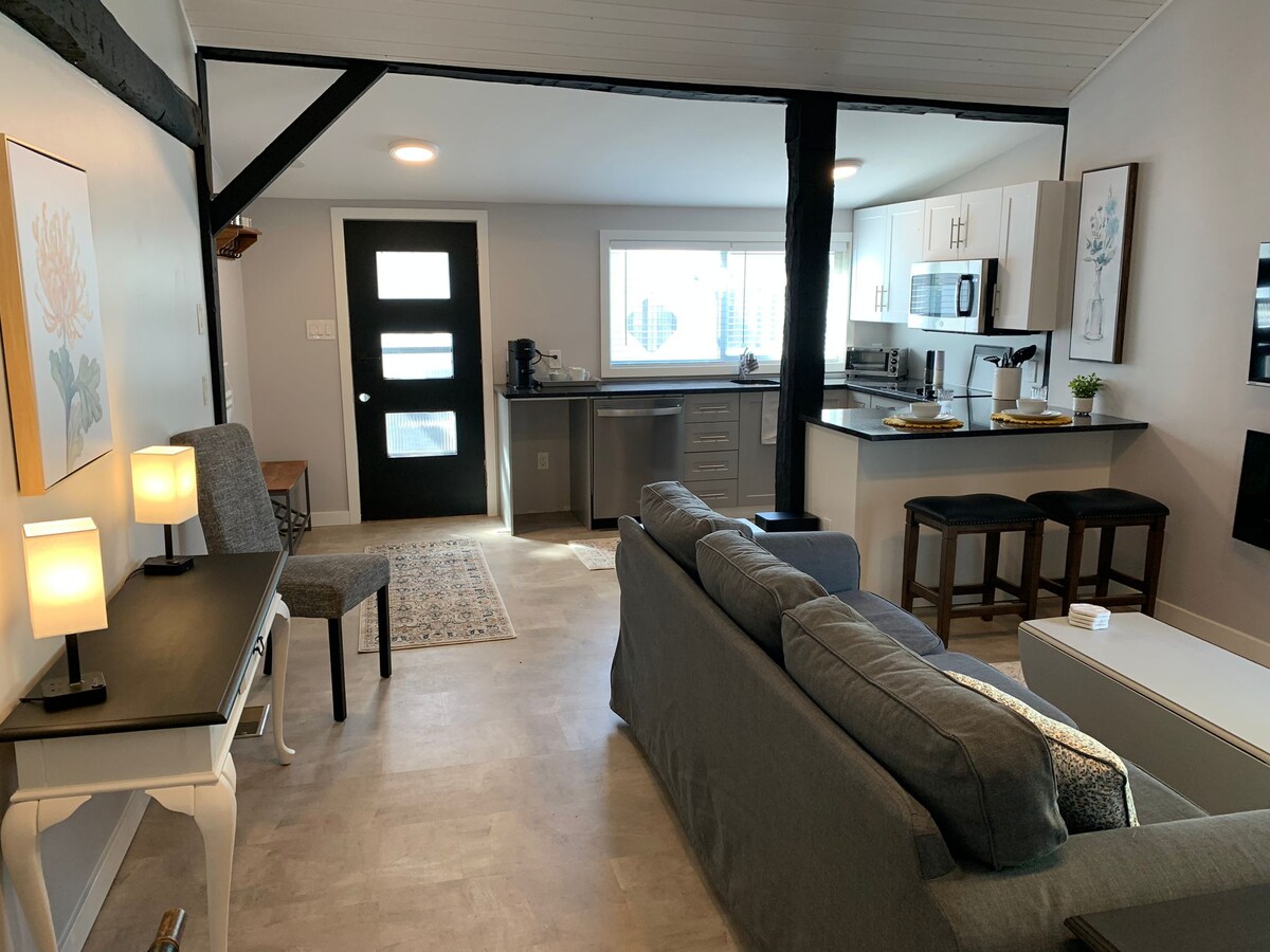 Het appartement "The Sojourn" is gemaakt door John en Sue met jouw comfort en privacy in gedachten. Een comfortabele, functionele ruimte met complete keuken, bureau/werkruimte, slaapkamer met queensize bed en tweepersoonskasten. Woonkamer met smart-tv (Netflix, Roku, Crave en meer), elektrische open haard, neerklapbare bank/queen bed. Sterke (Bell Fibe 1,5 gb) wifi. Een korte wandeling naar het beste wat Cobourg te bieden heeft (Victoria Park & Beach, West Beach Boardwalk, winkels en restaurants). Parkeergelegenheid op het terrein voor 1 auto.