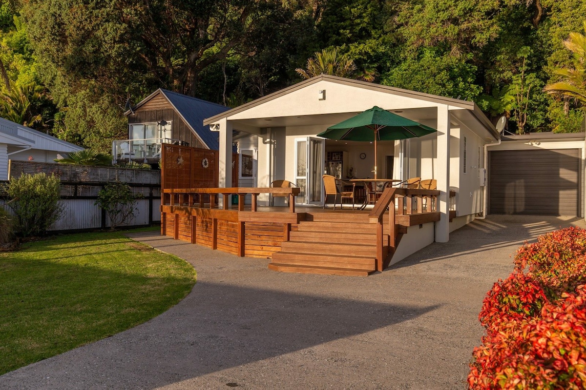 Dit originele 50's vakantiehuis ligt tussen de pohutukawa-bomen en ligt direct aan het strand van Whangamata. Geniet van een onbelemmerd uitzicht op de oceaan vanaf het dek en het enorme gazon aan de voorkant. De beroemde Whenuakura (Donut Is.) ligt tegenover, evenals Hauturu Motu (Clark Is.), bereikbaar te voet bij eb - een Kiwi-ritite van doorgang. Op enkele minuten van de lokale winkels, bars en cafés en op korte loopafstand van de dichtstbijzijnde supermarkt. Een geweldige kinderspeeltuin is te vinden bij Island View Reserve aan het einde van de weg.