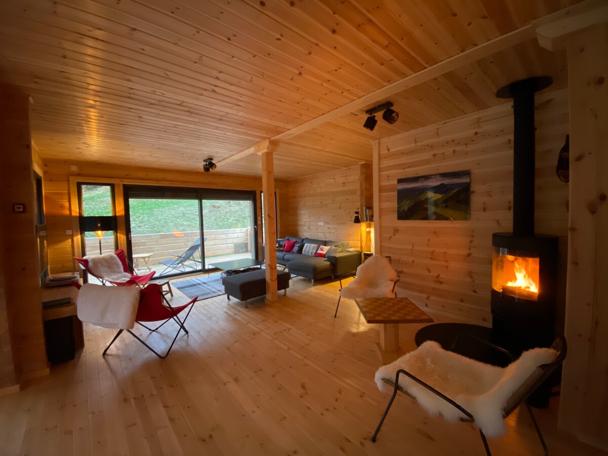 Houten chalet, met sobere en eigentijdse lijnen, een combinatie van modern comfort en warme decoratie met een prachtig uitzicht op de bergen, in een klein gehucht van 5 high-end chalets, gelegen in een bevoorrechte omgeving van onze kleine camping, startpunt van meerdere wandelingen en activiteiten. Een gratis sessie (1,5 uur) in de wellnessruimte, een apart gedeelte van het chalet, met volledig privé HOTTUB en SAUNA. Beddengoed en handdoeken zijn niet inbegrepen. Verhuur is mogelijk.