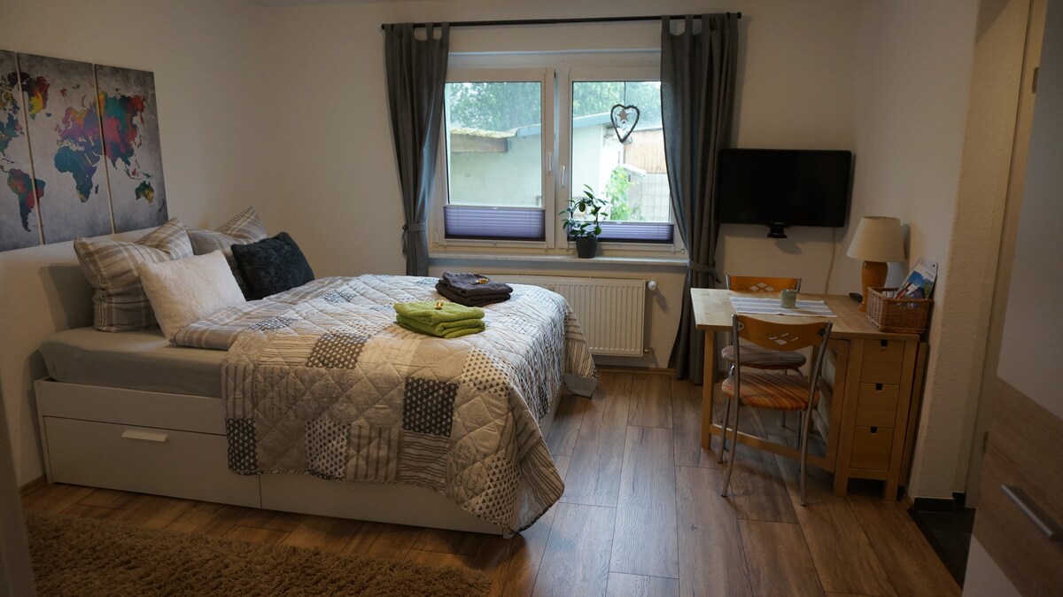 Herzlich willkommen! Euch erwartet ein modern eingerichtetes, kleines Studio im Hochparterre eines Zweifamilienhauses. Die Küche ist mit allem notwendigen ausgestattet: Kapselkaffeemaschine, Wasserkocher, Mikrowelle, Cerankochfeld, Kühlschrank. Der Ausblick geht in unseren schönen Garten, Fahrräder können dort abgestellt werden. Das Auto kann direkt vor dem Haus geparkt werden. In 10 Min. ist man mit dem Fahrrad in der schönen Innenstadt oder in 15 Min. am nächsten See. Keine zentrale Lage!