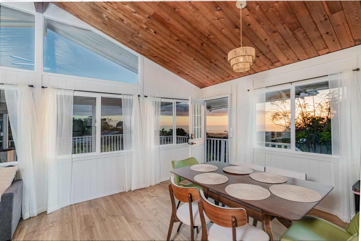 This is a comfortable 2 BD/2BA with rustic modern & eclectic decor, situated on a beautiful private acre of lush greenery. The living area is an open concept kitchen & living room with grand floor-to-ceiling windows showing off views of famous Mauna Kea. The generously sized master bedroom has a brand-new Avocado cal-king bed and a second bedroom offers a cozy queen. With a fully equipped kitchen & amenities, this is a perfect home base from which to begin or continue your Big Island experience!