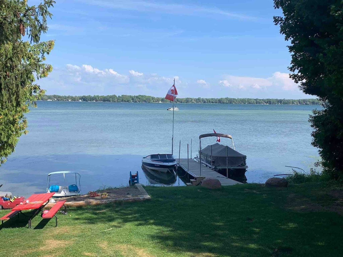 Slechts 1 kilometer voorbij Webers op Hwy 11! Een gezellige woning aan het meer met alle voorzieningen. Deze bungalow met 4 slaapkamers en 2 badkamers is geschikt voor 8 personen en is perfect voor alle seizoenen. Tot de voorzieningen behoren 2 complete badkamers, 2 volledige tv-kamers (1 met een dubbele modulaire bank) en een speelkamer met Foozball. Buitenpersoon? Veel zwemmen, vissen, peddelen, kanoën, lezen of een glas wijn aan het water. Ook op slechts 15 minuten van Casino Rama!