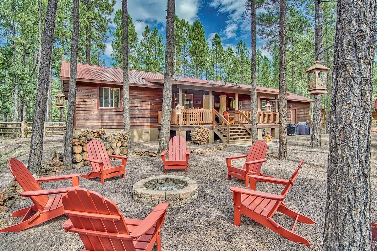 Our peaceful 2-bed/2-bath cabin on 1/2 acre has everything you need! This White Mountain cabin is a 5 min drive to Fool Hollow Lake, where you can kayak, fish & paddle-board! We have a paddle board for guests! The cabin is nearby delicious restaurants, scenic hikes and is only one hour from Sunrise Mountain for skiing! Enjoy the cabin's indoor fireplace, outdoor grill, corn hole, horseshoe & fire pit! Our cabin has heating + mini split & portable AC window unit for the beautiful summer months.