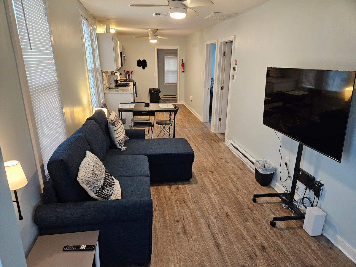 Gezellig strandhuisje met 2 slaapkamers op een steenworp afstand van Keansburg Beach en de promenade. Geniet van uitzicht op de oceaan, een eigen patio, Smart HDTV, snelle wifi en een volledig uitgeruste keuken. Beide slaapkamers hebben queensize bedden met verduisterende gordijnen. Centrale airconditioning, wasserette in de unit en een bureau voor afstandswerken inbegrepen. Huisdiervriendelijk voor kleine honden onder de 18 kg. Gratis parkeren. Loop naar cafés, waterpark, en veerboot naar NYC. Perfect voor stellen, gezinnen en digitale nomaden.