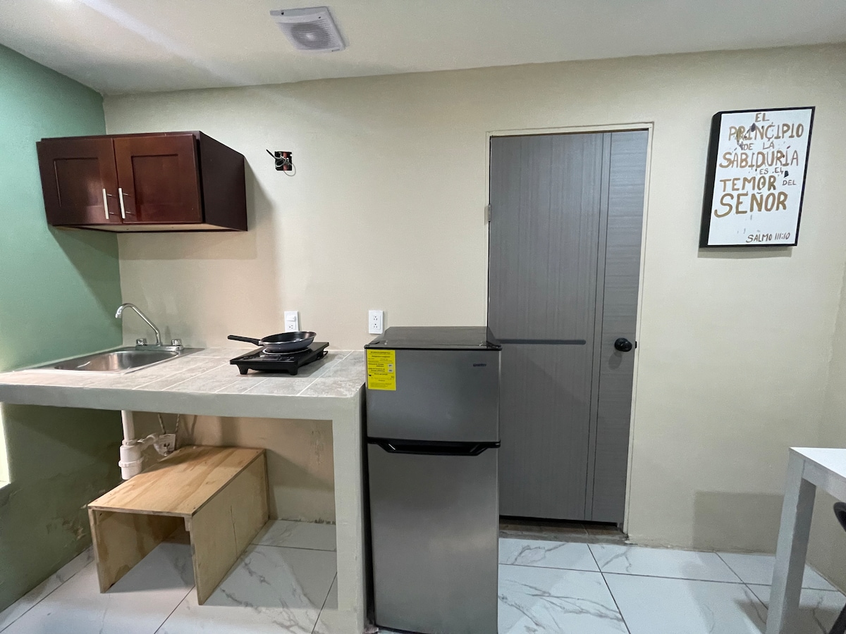 Bezoek onze virtuele tour via de QR-code die op de foto 's wordt gepubliceerd. - Privé parkeren met elektrische poort - Deuren met beveiligingssleutel - Complete keuken en bar, koelkast, fornuis, fornuis, koffiezetapparaat, magnetron, magnetron, complete servies - 1 slaapkamer met kledingkast, bureau, queensize bed en dekens - 1 complete badkamer, shampoo en zeep, handdoeken - 1 slaapbank en Smart-tv, Netflix. - 1 blok van Independence Avenue, 5 minuten van het luxe gebied en 10 minuten van Justo Sierra Avenue