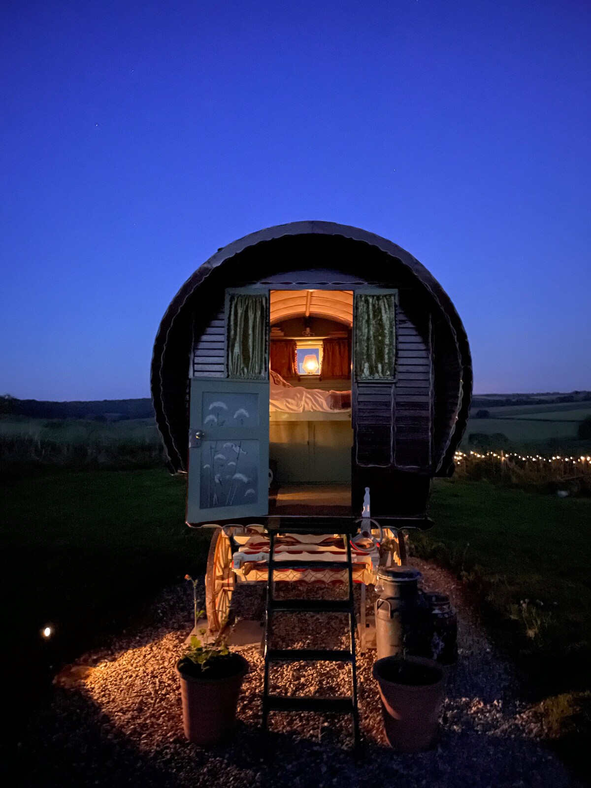 Beautifully restored traditional Bow Top Wagon, with a very comfortable double bed, shower and loo, fully functioning kitchen. Cook with fire and enjoy beautiful landscapes!