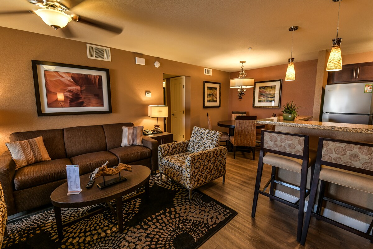 Deze luxe suites van 580 m ² bieden plaats aan vier gasten en zijn smaakvol ingericht met alle gemakken van thuis in gedachten. Het beschikt over een kingsize bed in de eigen slaapkamer, een slaapbank in de woonkamer en een volledig uitgeruste kitchenette met granieten aanrechtbladen, minikoelkast, magnetron en koffiezetapparaat. Als je op zoek bent naar een suite met 1 slaapkamer in Las Vegas met net genoeg ruimte voor een kleiner gezin, dan is dit de perfecte optie.