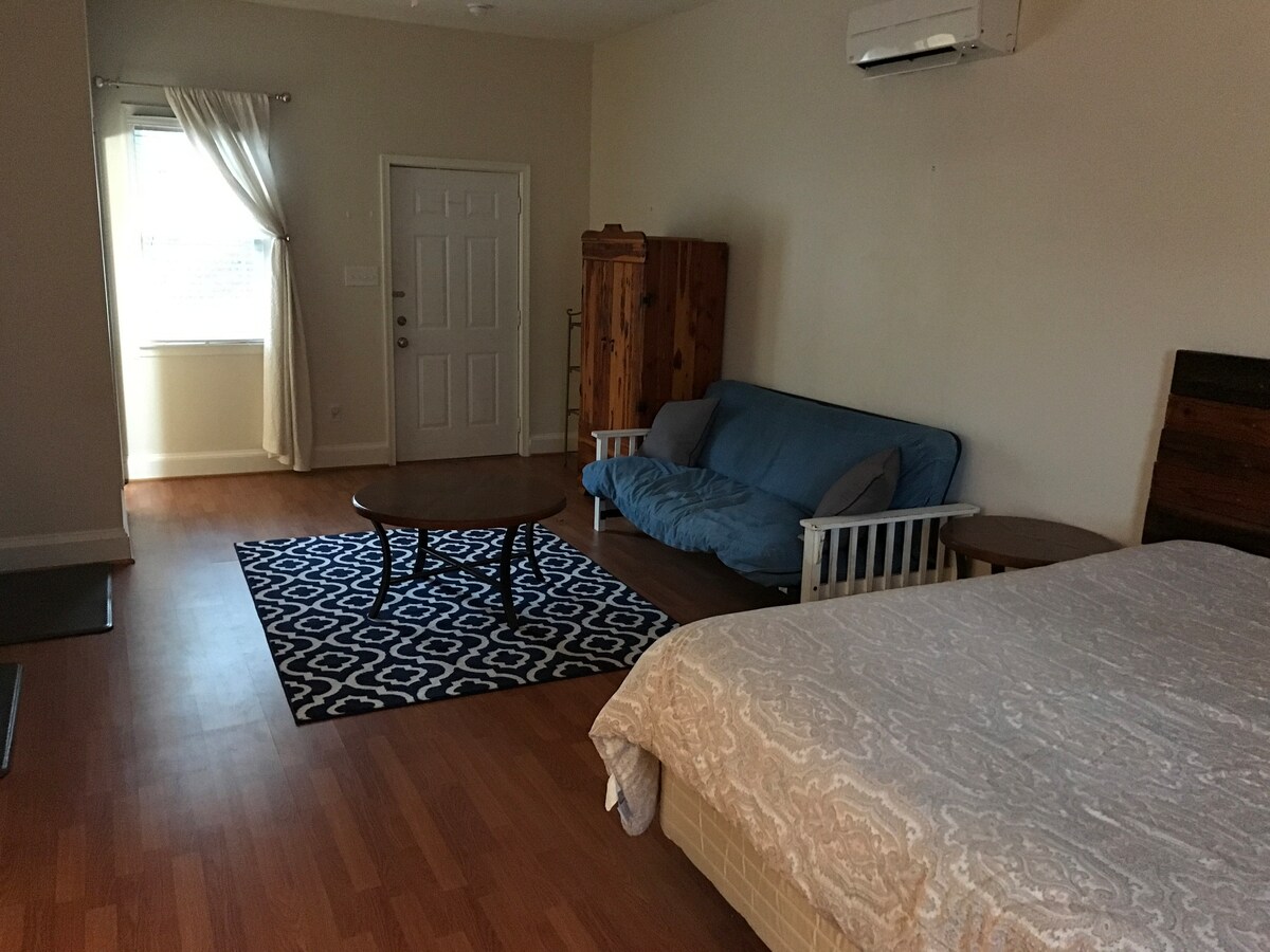 Long Term Stay in Cozy studio apartment with a full bathroom and kitchenette. Comfortable queen sized bed and a futon that can be used to sleep a third person, or two guests who prefer to sleep separate. Separate entrance with off-street parking. Close to many restaurants and breweries. We are a quiet family, and enjoy cooking, listening to music, most outdoor activities, and taking walks around the neighborhood. **guests must have past Airbnb reviews to book the room. Thanks! Mike & Lisa