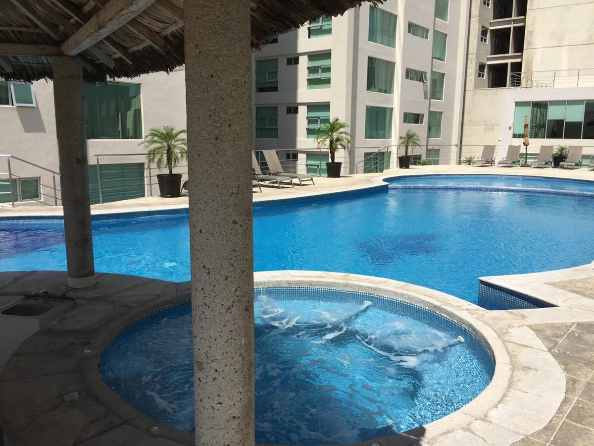 Appartement aan de oceaan in Colinas del Mar, een van de modernste gebouwen in Veracruz. Geniet van een panoramisch uitzicht, een zwembad en jacuzzi, terrassen, een uitgeruste fitnessruimte, een businesscentrum, een barbecue, een speelkamer en kinderspellen. Het gebouw heeft 24/7 bewaking en drie liften voor jouw gemak. Toplocatie, dicht bij restaurants, winkelcentra en wandelingen, met de rust van een veilige omgeving aan de oceaan. Ideaal voor stellen, gezinnen en lange verblijven.