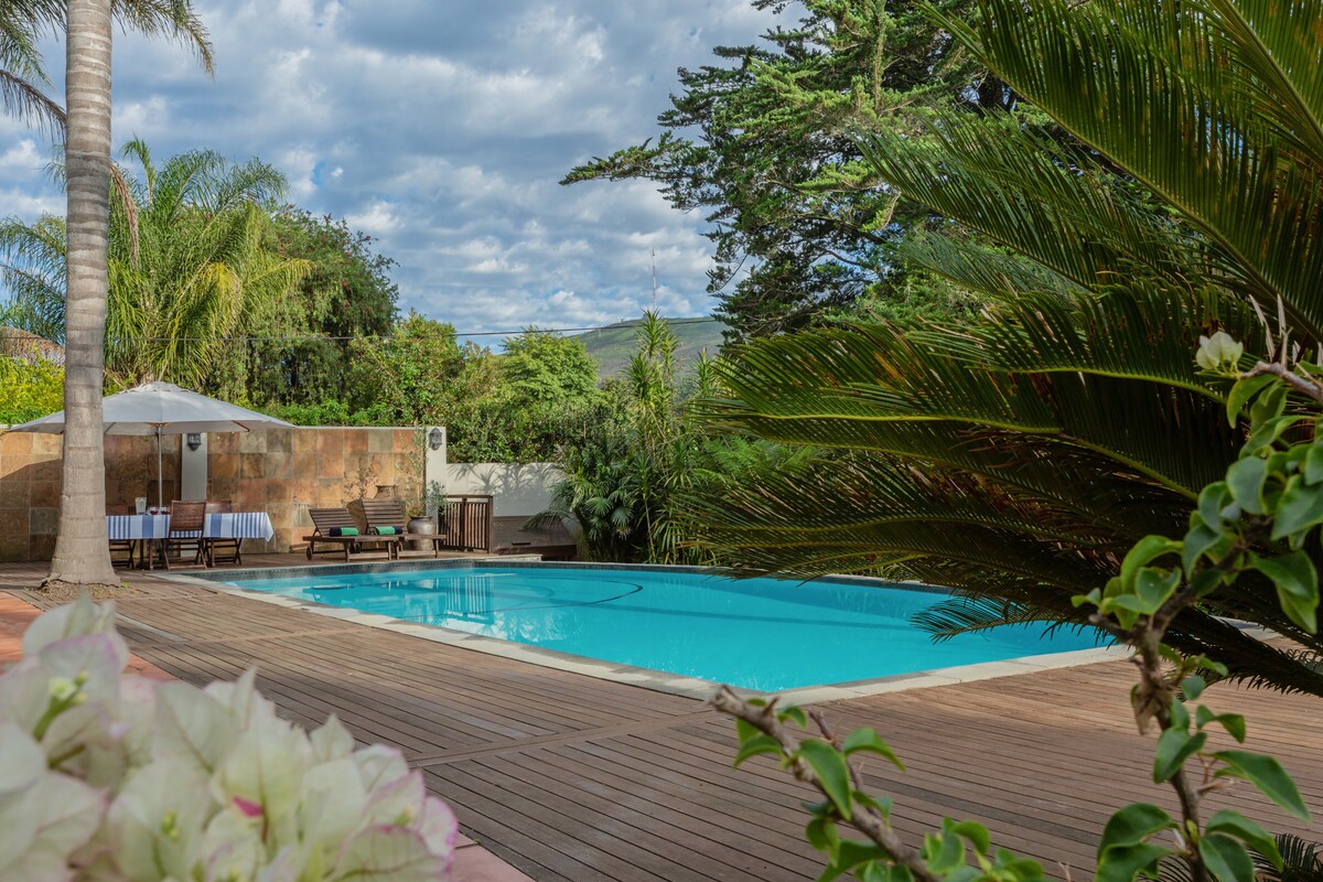 Aan de voet van het Outeniqua-gebergte, in de buurt van wandelpaden in een natuurgebied kun je ontspannen en het allemaal in je opnemen. Familiemarkten in het weekend met een breed scala aan eten en drinken zorgen voor een geweldig dagje uit. Met zoveel stranden is het gemakkelijk om een afgelegen plek te vinden en te genieten van een rustige picknick. Je kunt zelfs genieten van de privébraaikamer naast het appartement of ontspannen naast het zwembad. Eén nacht is te kort om alles in je op te nemen. Appartement met eigen ingang, eigen badkamer met douche en met een kleine kitchenette