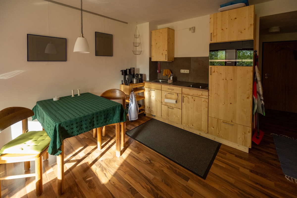 het is een slaapkamer van ongeveer 13 m ², een gezellige kleine keuken, met tafel en stoelen en een badkamer met bad, toilet en douche. De slaapkamer en de keuken hebben toegang tot balkon en terras, met uitzicht op de Ammersee. Daarnaast is er een buitenstoel om te ontspannen in het aangrenzende bos, dat ook bij het appartement hoort. De auto kan geparkeerd worden in de ondergrondse garage. Een wandeling van 10 minuten leidt naar het meer en de strandpromenade
