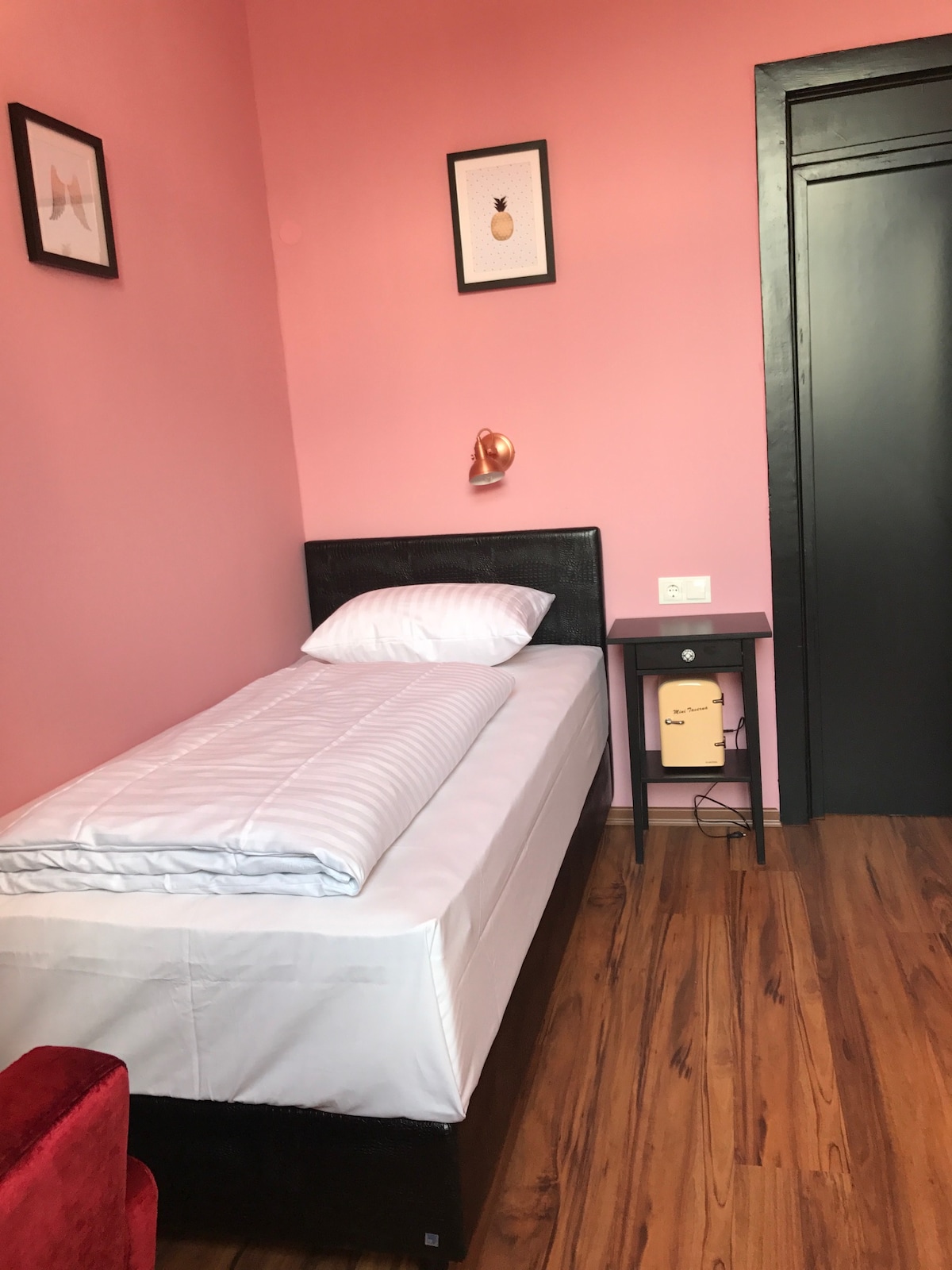 Hotel achtige kamer met comfortabel tweepersoonsbed (1.40mx2.00m). Snelle toegang tot metrolijnen (S-Bahn), autobahn, luchthaven, beurs en twee stadscentra (Frankfurt & Offenbach).