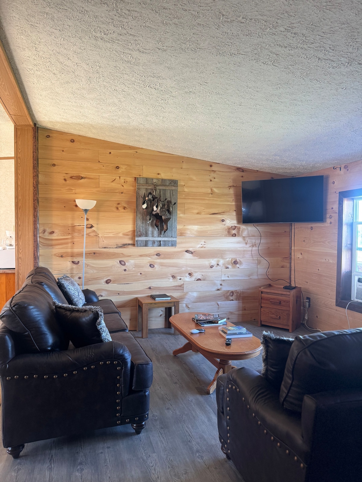 Cottontail Cabin, genesteld op 22 hectare serene bossen! Dit is het perfecte toevluchtsoord voor diegenen die op zoek zijn naar een ontspannen en verjongend uitje midden in de natuur. De hut is volledig uitgerust met alle voorzieningen om uw verblijf comfortabel en aangenaam te maken. Met 2 slaapkamers en een slaapbank is de hut geschikt voor 6 personen. De hut is voorzien van opblaasverwarming en een houtkachel om je warm en gezellig te houden. We hebben een full-size bubbelbad en een houtgestookte sauna!